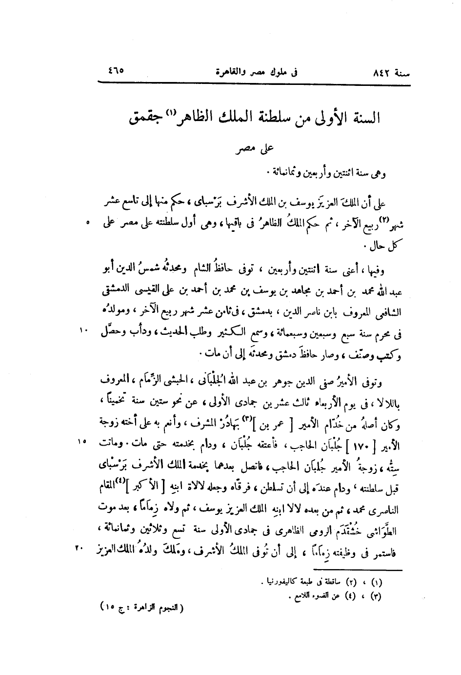 على أن الملك العزيز يوسف بن الملك الأشرف برسباى، حكم منها إلى تاسع عشر شهر «2» ربيع الآخر، ثم حكم الملك الظاهر فى باقيها، وهى أول سلطنته على مصر على كل حال.