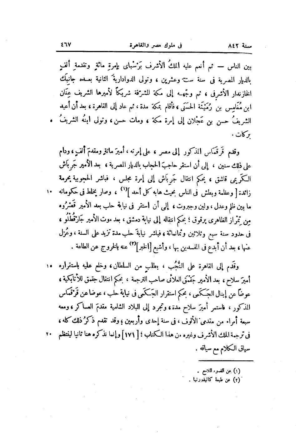 وقدم إلى القاهرة على النّجب، بطلب من السلطان، وخلع عليه باستقراره أمير سلاح، بعد الأمير جقمق العلائى صاحب الترجمة، بحكم انتقال جقمق للأتابكية، عوضا عن إينال الجكمى، بحكم استقرار الجكمى فى نيابة حلب، عوضا عن قرقماس المذكور، فاستمر أمير سلاح مدة، وتجرد إلى البلاد الشامية مقدم العساكر، ومعه سبعة أمراء من مقدمى الألوف، فى سنة إحدى وأربعين؛ وقد تقدم ذكر ذلك كله، فى ترجمة الملك الأشرف وغيره من هذا الكتاب؛ [171] وإنما نذكره هنا ثانيا لينتظم سياق الكلام مع سياقه.