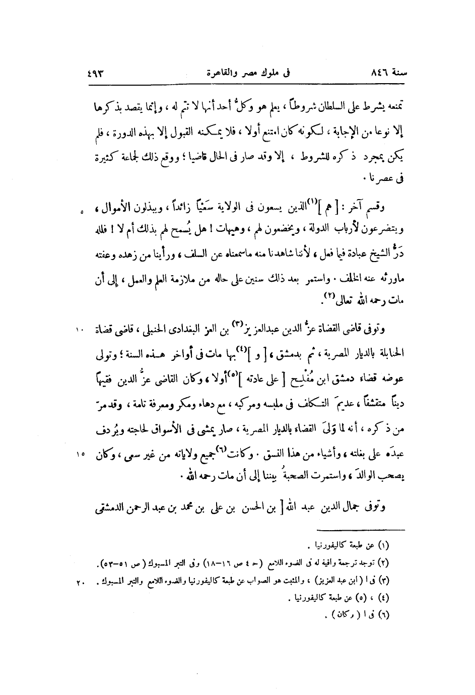 وتوفى قاضى القضاة عزّ الدين عبد العزيز «3» بن العز البغدادى الحنبلى، قاضى قضاة الحنابلة بالديار المصرية، ثم بدمشق، [و] «4» بها مات فى أواخر هذه السنة؛ وتولى عوضه قضاء دمشق ابن مفلح [على عادته] «5» أولا، وكان القاضى عزّ الدين فقيها دينا متقشفا، عديم التكلف فى ملبسه ومركبه، مع دهاء ومكر ومعرفة تامة، وقد مرّ من ذكره، أنه لما ولى القضاء بالديار المصرية، صار يمشى فى الأسواق لحاجته ويردف عبده على بغلته، وأشياء من هذا النسق. وكانت «6» جميع ولاياته من غير سعى، وكان يصحب الوالد، واستمرت الصحبة بيننا إلى أن مات رحمه الله.
