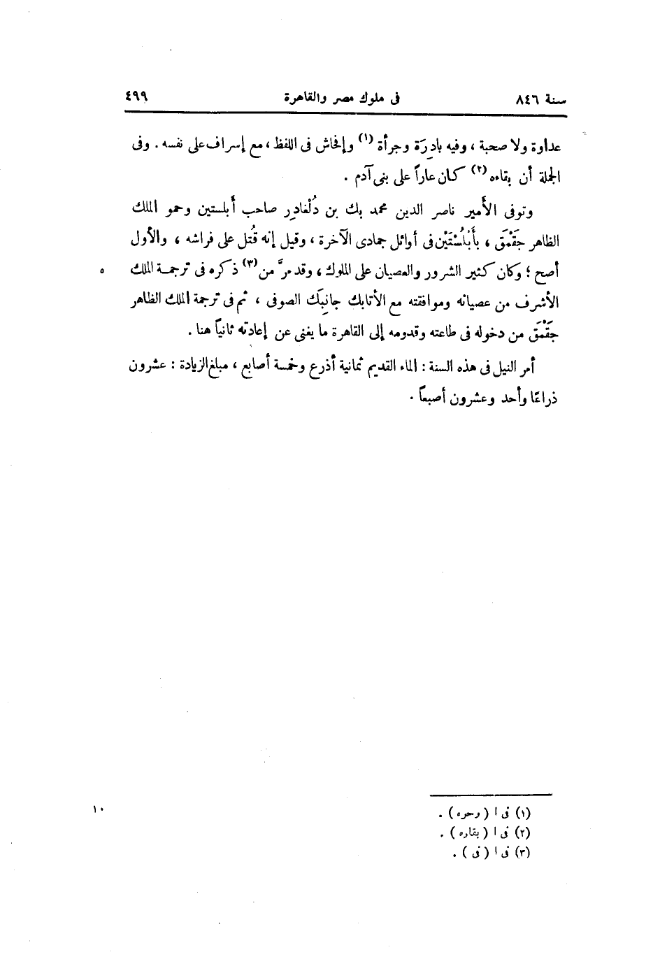 وتوفى الأمير ناصر الدين محمد بك بن دلغادر صاحب أبلستين وحمو الملك الظاهر جقمق، بأبلستين فى أوائل جمادى الآخرة، وقيل إنه قتل على فراشه، والأول أصح؛ وكان كثير الشرور والعصيان على الملوك، وقد مرّ من «3» ذكره فى ترجمة الملك الأشرف من عصيانه وموافقته مع الأتابك جانبك الصوفى، ثم فى ترجمة الملك الظاهر جقمق من دخوله فى طاعته وقدومه إلى القاهرة ما يغنى عن إعادته ثانيا هنا.