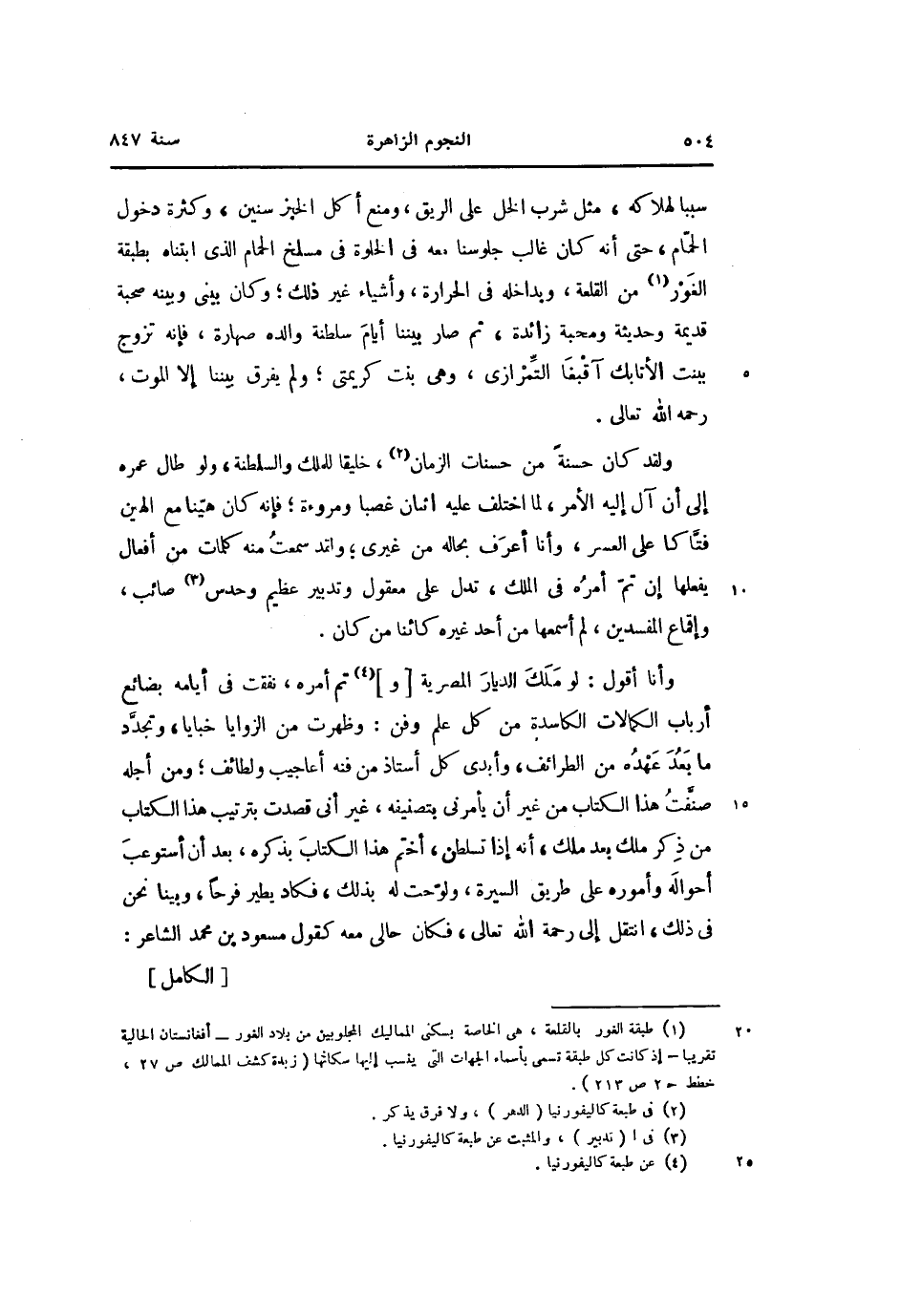 وأنا أقول: لو ملك الديار المصرية [و] «4» تم أمره، نفقت فى أيامه بضائع أرباب الكمالات الكاسدة من كل علم وفن: وظهرت من الزوايا خبايا، وتجدّد ما بعد عهده من الطرائف، وأبدى كل أستاذ من فنه أعاجيب ولطائف؛ ومن أجله صنّفت هذا الكتاب من غير أن يأمرنى بتصنيفه، غير أنى قصدت بترتيب هذا الكتاب من ذكر ملك بعد ملك، أنه إذا تسلطن، أختم هذا الكتاب بذكره، بعد أن أستوعب أحواله وأموره على طريق السيرة، ولوّحت له بذلك، فكاد يطير فرحا، وبينا نحن فى ذلك، انتقل إلى رحمة الله تعالى، فكان حالى معه كقول مسعود بن محمد الشاعر: