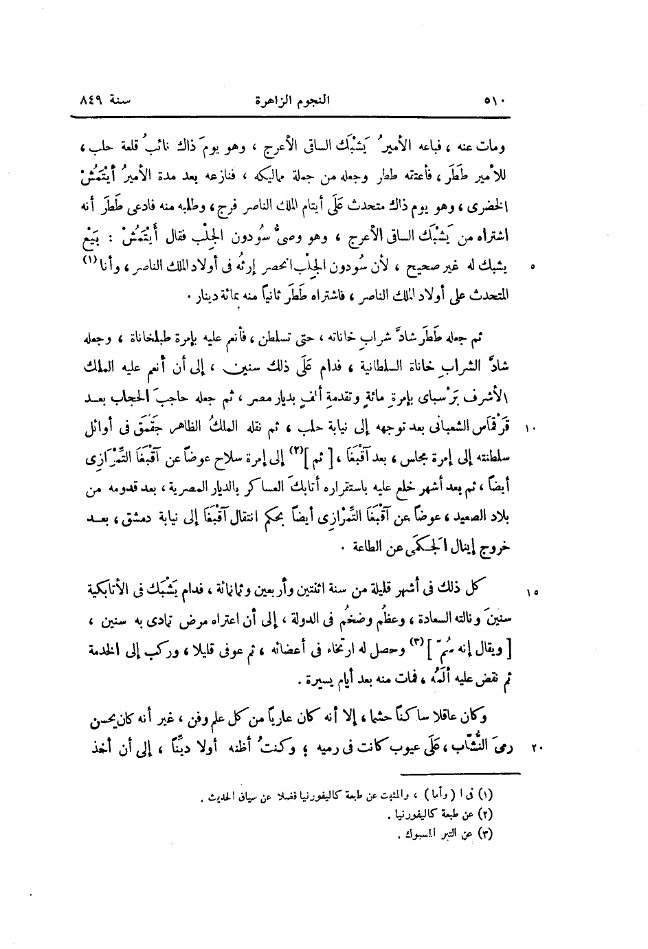 ومات عنه، فباعه الأمير يشبك الساقى الأعرج، وهو يوم ذاك نائب قلعة حلب، للأمير ططر، فأعتقه ططر وجعله من جملة مماليكه، فنازعه بعد مدة الأمير أيتمش الخضرى، وهو يوم ذاك متحدث على أيتام الملك الناصر فرج، وطلبه منه فادعى ططر أنه اشتراه من يشبك الساقى الأعرج، وهو وصىّ سودون الجلب فقال أيتمش: بيع يشبك له غير صحيح، لأن سودون الجلب انحصر إرثه فى أولاد الملك الناصر، وأنا «1» المتحدث على أولاد الملك الناصر، فاشتراه ططر ثانيا منه بمائة دينار.