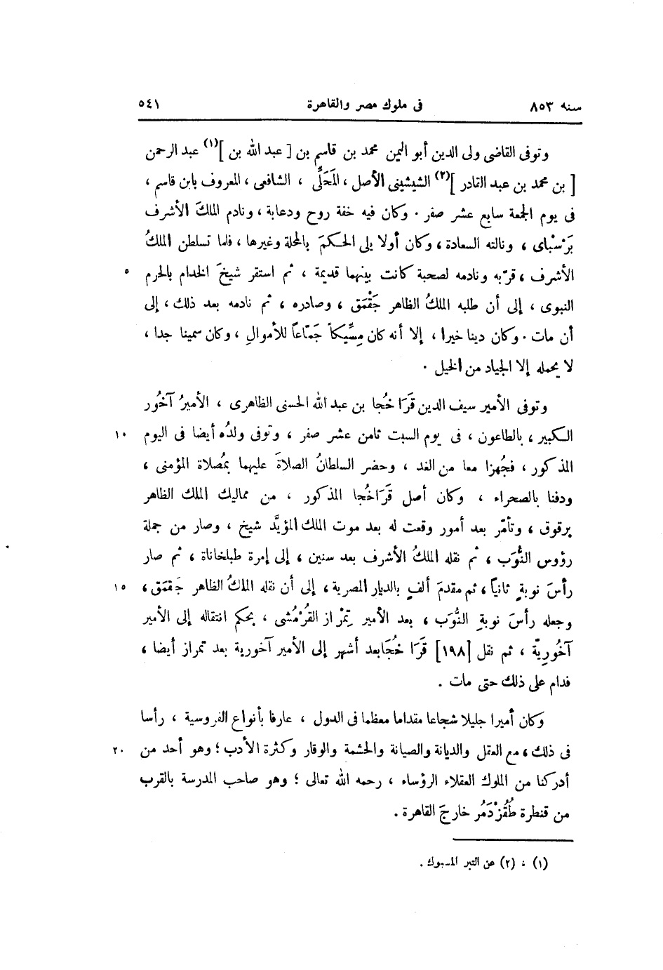 وتوفى القاضى ولى الدين أبو اليمن محمد بن قاسم بن [عبد الله بن] «1» عبد الرحمن [بن محمد بن عبد القادر] «2» الشيشينى الأصل، المحلّى، الشافعى، المعروف بابن قاسم، فى يوم الجمعة سابع عشر صفر. وكان فيه خفة روح ودعابة، ونادم الملك الأشرف برسباى، ونالته السعادة، وكان أولا يلى الحكم بالمحلة وغيرها، فلما تسلطن الملك الأشرف، قرّبه ونادمه لصحبة كانت بينهما قديمة، ثم استقر شيخ الخدام بالحرم النبوى، إلى أن طلبه الملك الظاهر جقمق، وصادره، ثم نادمه بعد ذلك، إلى أن مات. وكان دينا خيرا، إلا أنه كان مسّيكا جمّاعا للأموال، وكان سمينا جدا، لا يحمله إلا الجياد من الخيل.
