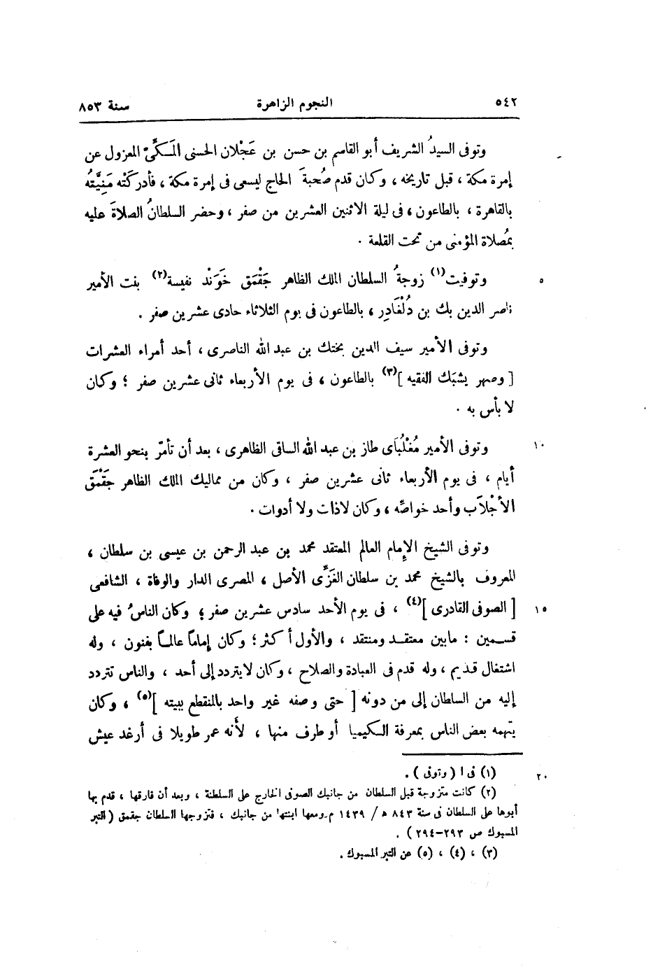 وتوفيت «1» زوجة السلطان الملك الظاهر جقمق خوند نفيسة «2» بنت الأمير ناصر الدين بك بن دلغادر، بالطاعون فى يوم الثلاثاء حادى عشرين صفر.