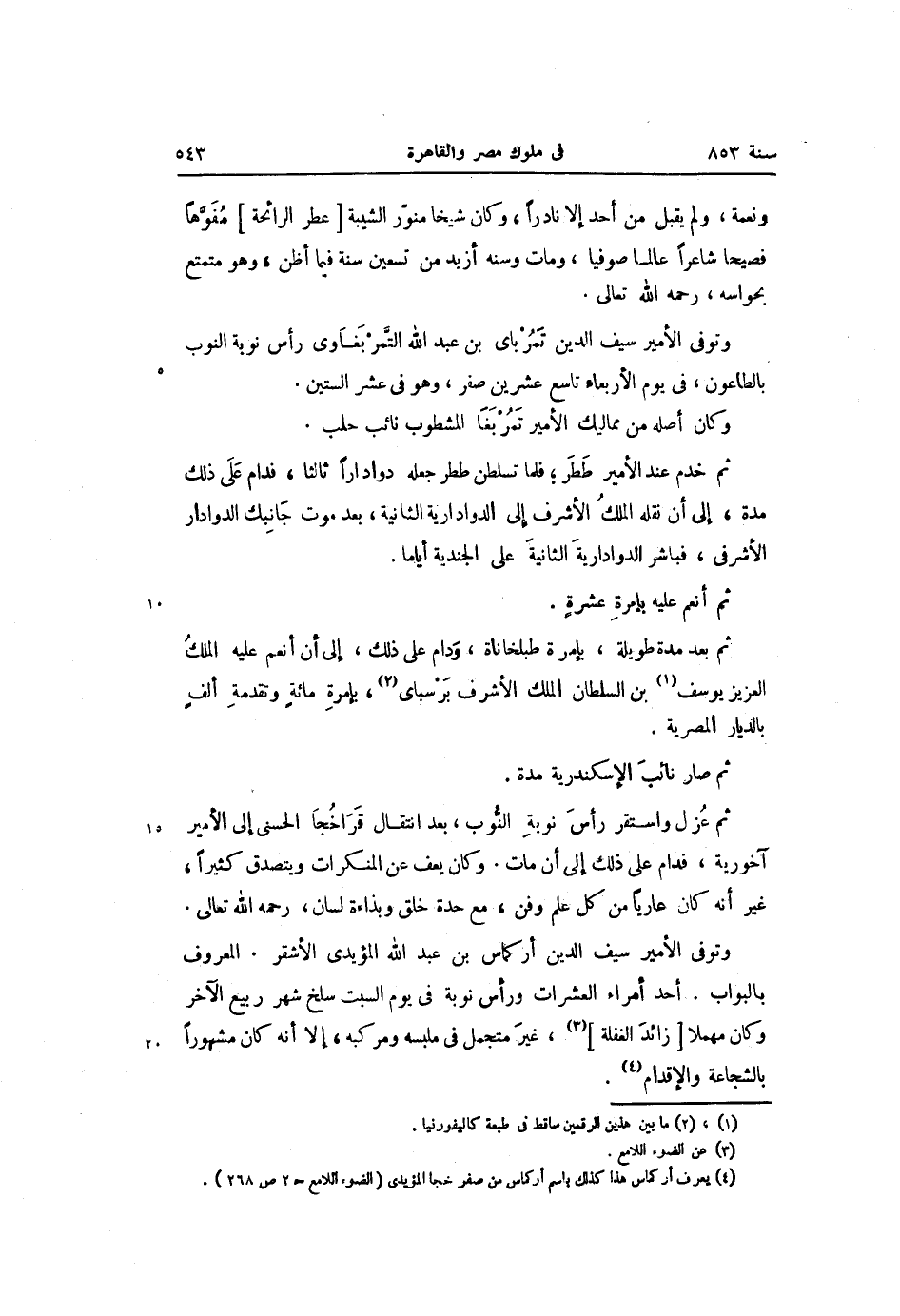 وتوفى الأمير سيف الدين أركماس بن عبد الله المؤيدى الأشقر. المعروف بالبواب. أحد أمراء العشرات ورأس نوبة فى يوم السبت سلخ شهر ربيع الآخر وكان مهملا [زائد الغفلة] «3» ، غير متجمل فى ملبسه ومركبه، إلا أنه كان مشهورا بالشجاعة والإقدام «4» .