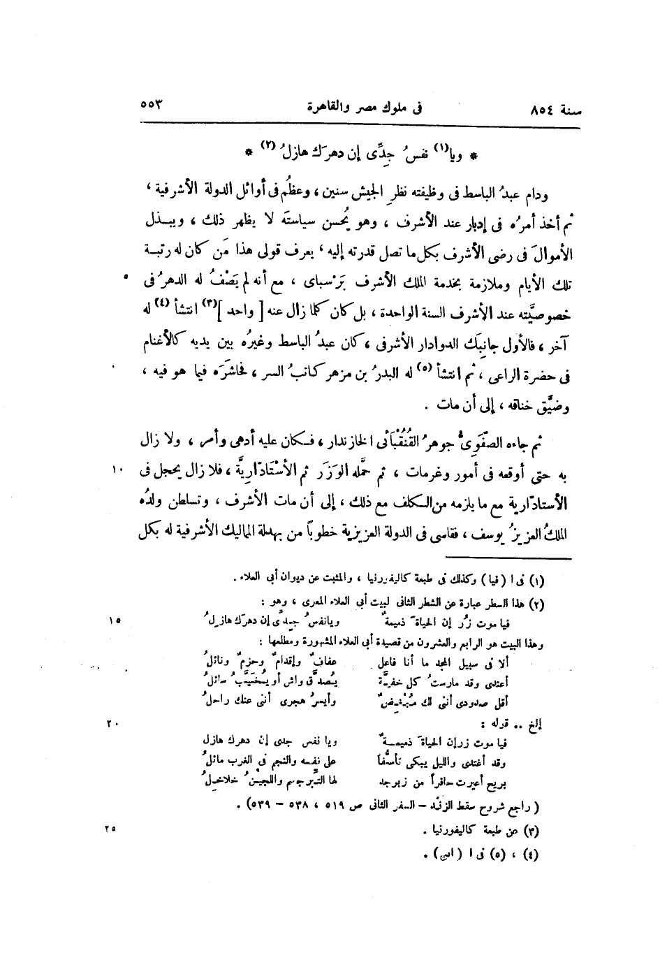 * ويا «1» نفس جدّى إن دهرك هازل «2» * ودام عبد الباسط فى وظيفته نظر الجيش سنين، وعظم فى أوائل الدولة الأشرفية، ثم أخذ أمره فى إدبار عند الأشرف، وهو يحسن سياسته لا يظهر ذلك، ويبذل الأموال فى رضى الأشرف بكل ما تصل قدرته إليه، يعرف قولى هذا من كان له رتبة تلك الأيام وملازمة بخدمة الملك الأشرف برسباى، مع أنه لم يصف له الدهر فى خصوصيّته عند الأشرف السنة الواحدة، بل كان كلما زال عنه [واحد] «3» انتشأ «4» له آخر، فالأول جانبك الدوادار الأشرفى، كان عبد الباسط وغيره بين يديه كالأغنام فى حضرة الراعى، ثم انتشأ «5» له البدر بن مزهر كاتب السر، فحاشره فيما هو فيه، وضيّق خناقه، إلى أن مات.