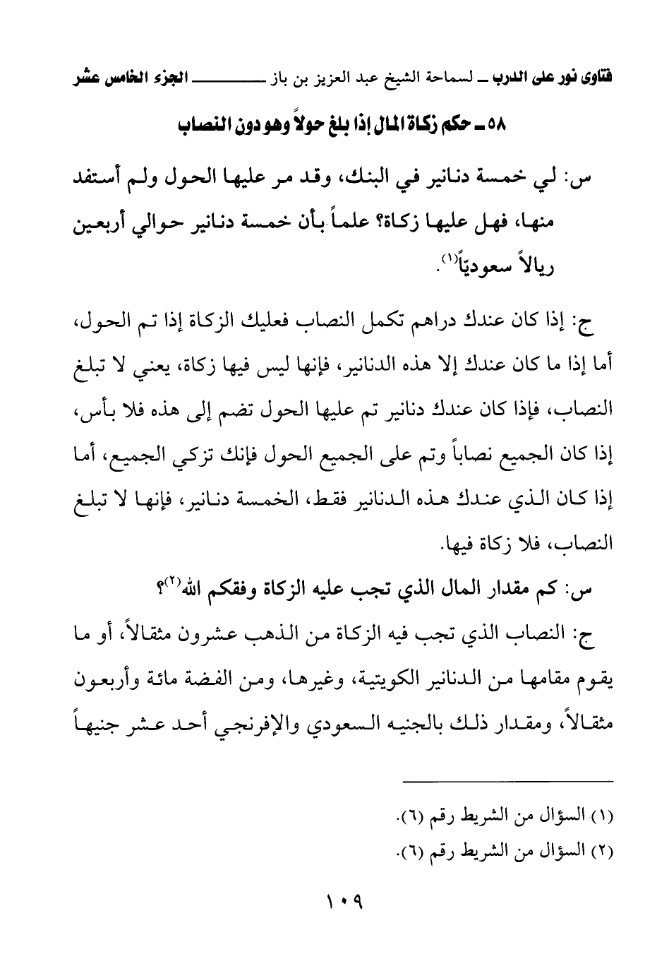 س: لي خمسة دنانير في البنك، وقد مر عليها الحول ولم أستفد منها، فهل عليها زكاة؟ علمًا بأن خمسة دنانير حوالي أربعين ريالاً سعوديًّا (¬1) (¬2).