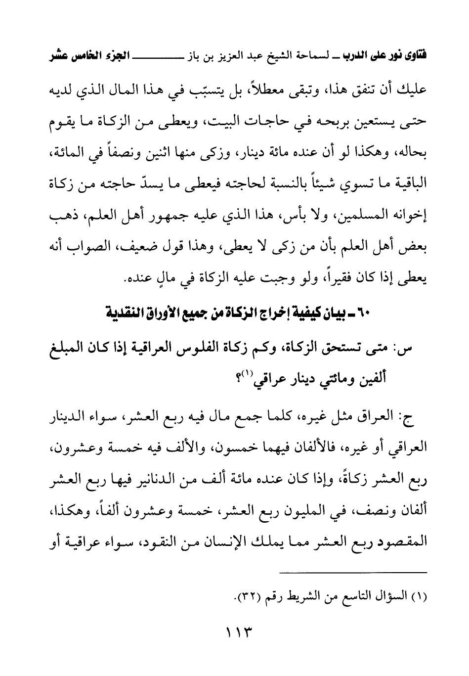 ج: العراق مثل غيره، كلما جمع مال فيه ربع العشر، سواء الدينار العراقي أو غيره، فالألفان فيهما خمسون، والألف فيه خمسة وعشرون، ربع العشر زكاةً، وإذا كان عنده مائة ألف من الدنانير فيها ربع العشر ألفان ونصف، في المليون ربع العشر، خمسة وعشرون ألفًا، وهكذا، المقصود ربع العشر مما يملك الإنسان من النقود، سواء عراقية أو