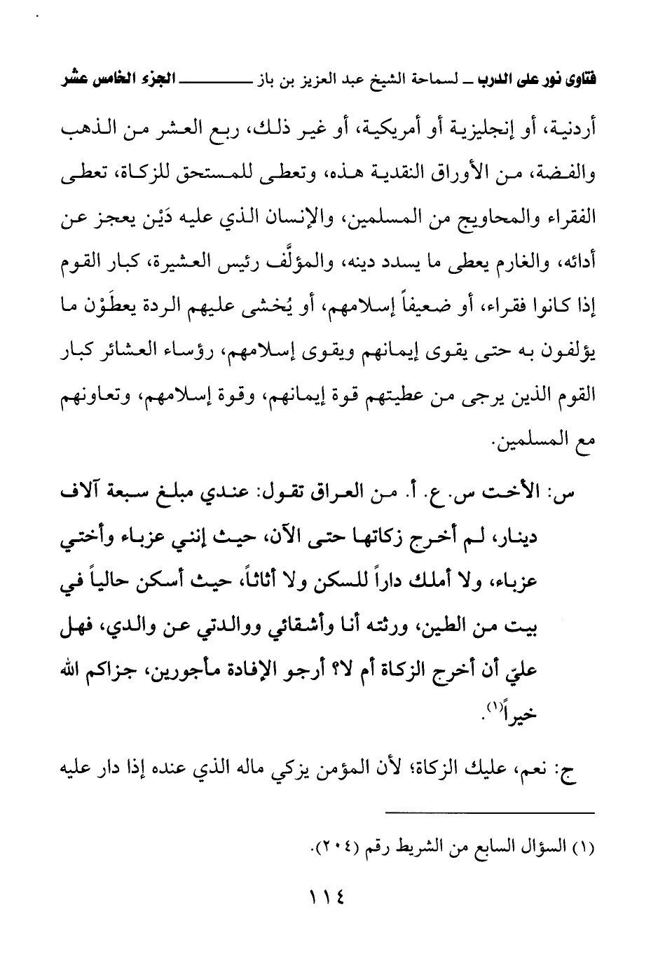 أردنية، أو إنجليزية أو أمريكية، أو غير ذلك، ربع العشر من الذهب والفضة، من الأوراق النقدية هذه، وتعطى للمستحق للزكاة، تعطى الفقراء والمحاويج من المسلمين، والإنسان الذي عليه دَيْن يعجز عن أدائه، والغارم يعطى ما يسدد دينه، والمؤلَّف رئيس العشيرة، كبار القوم إذا كانوا فقراء، أو ضعيفًا إسلامهم، أو يُخشى عليهم الردة يعطَوْن ما يؤلفون به حتى يقوى إيمانهم ويقوى إسلامهم، رؤساء العشائر كبار القوم الذين يرجى من عطيتهم قوة إيمانهم، وقوة إسلامهم، وتعاونهم مع المسلمين.