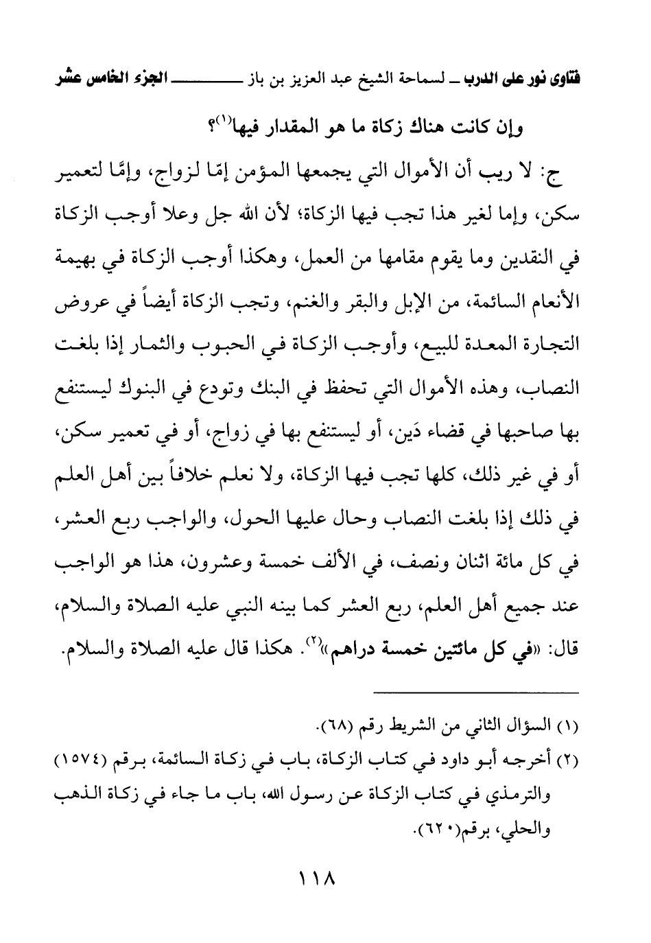 (¬2) أخرجه أبو داود في كتاب الزكاة، باب في زكاة السائمة، برقم (1574) والترمذي في كتاب الزكاة عن رسول الله، باب ما جاء في زكاة الذهب والحلي، برقم (620).