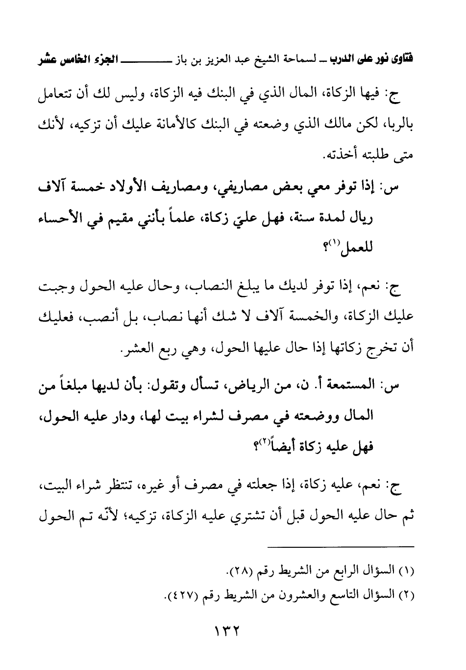 ج: نعم، عليه زكاة، إذا جعلته في مصرف أو غيره، تنتظر شراء البيت، ثم حال عليه الحول قبل أن تشتري عليه الزكاة، تزكيه؛ لأنّه تم الحول