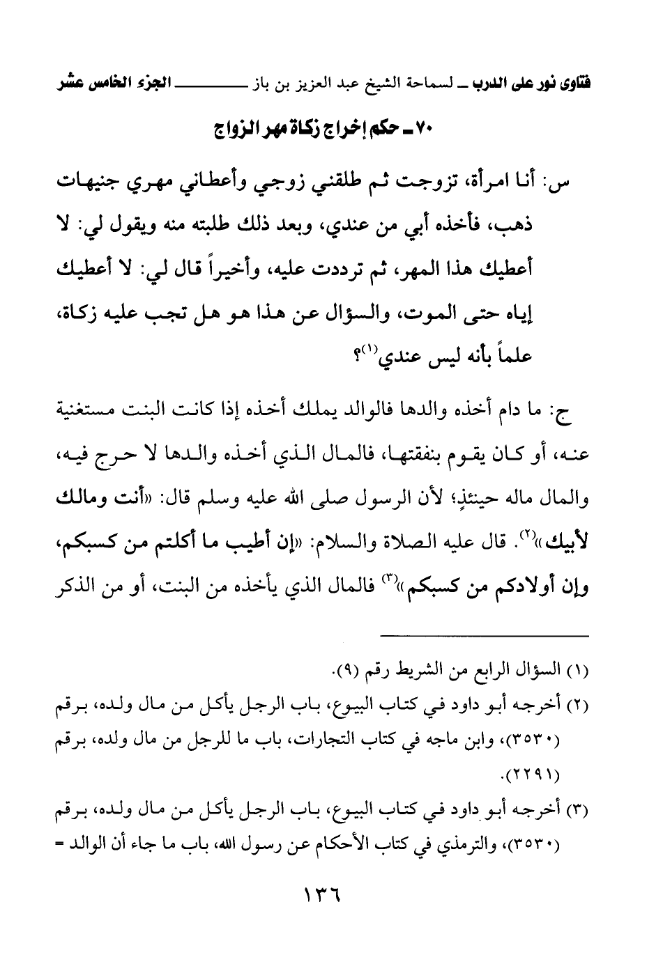 ج: ما دام أخذه والدها فالوالد يملك أخذه إذا كانت البنت مستغنية عنه، أو كان يقوم بنفقتها، فالمال الذي أخذه والدها لا حرج فيه، والمال ماله حينئذٍ؛ لأن الرسول صلى الله عليه وسلم قال: «أنت ومالك لأبيك» (¬2) قال عليه الصلاة والسلام: «إن أطيب ما أكلتم من كسبكم، وإن أولادكم من كسبكم» (¬3) فالمال الذي يأخذه من البنت، أو من الذكر
