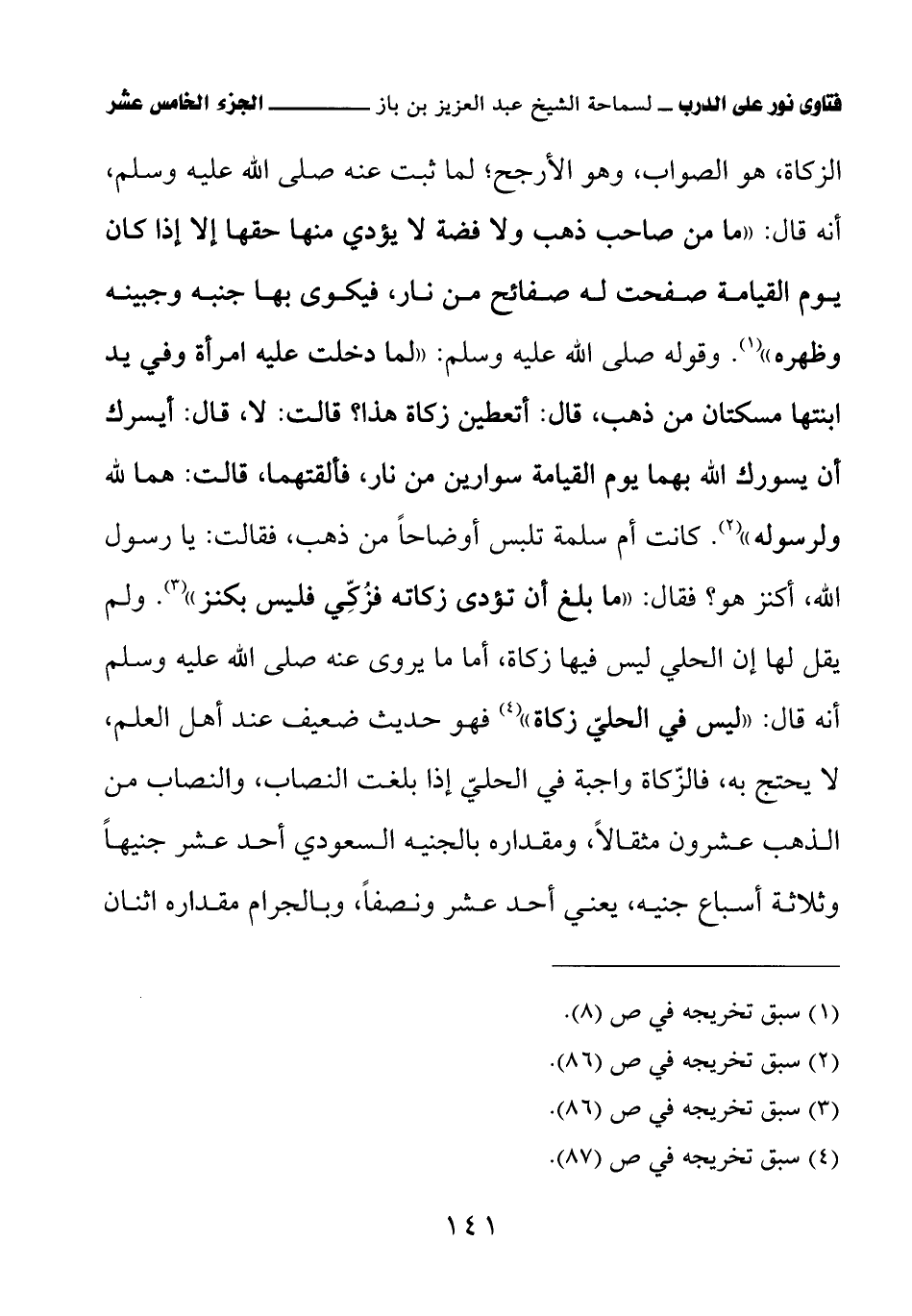 الزكاة، هو الصواب، وهو الأرجح؛ لما ثبت عنه صلى الله عليه وسلم، أنه قال: «ما من صاحب ذهب ولا فضة لا يؤدي منها حقها إلا إذا كان يوم القيامة صفحت له صفائح من نار، فيكوى بها جنبه وجبينه وظهره» (¬1) وقوله صلى الله عليه وسلم: «لما دخلت عليه امرأة وفي يد ابنتها مسكتان من ذهب، قال: أتعطين زكاة هذا؟ قالت: لا، قال: أيسرك أن يسورك الله بهما يوم القيامة سوارين من نار، فألقتهما، قالت: هما لله ولرسوله» (¬2) «كانت أم سلمة تلبس أوضاحًا من ذهب، فقالت: يا رسول الله، أكنز هو؟ فقال: ما بلغ أن تؤدى زكاته فزُكِّي فليس بكنز» (¬3) ولم يقل لها إن الحلي ليس فيها زكاة، أما ما يروى عنه صلى الله عليه وسلم أنه قال: «ليس في الحليّ زكاة» (¬4) فهو حديث ضعيف عند أهل العلم، لا يحتج به، فالزّكاة واجبة في الحليّ إذا بلغت النصاب، والنصاب من الذهب عشرون مثقالاً، ومقداره بالجنيه السعودي أحد عشر جنيهًا وثلاثة أسباع جنيه، يعني أحد عشر ونصفًا، وبالجرام مقداره اثنان