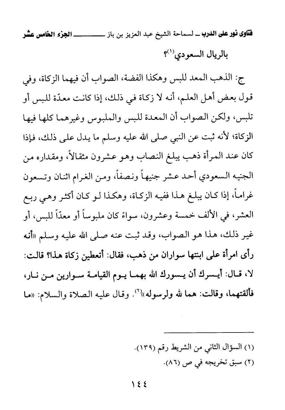ج: الذهب المعد للبس وهكذا الفضة، الصواب أن فيهما الزكاة، وفي قول بعض أهل العلم، أنه لا زكاة في ذلك، إذا كانت معدّة للبس أو تلبس، ولكن الصواب أن المعدة للبس والملبوس وغيرهما كلها فيها الزكاة؛ لأنه ثبت عن النبي صلى الله عليه وسلم ما يدل على ذلك، فإذا كان عند المرأة ذهب يبلغ النصاب وهو عشرون مثقالاً، ومقداره من الجنيه السعودي أحد عشر جنيهًا ونصفًا، ومن الغرام اثنان وتسعون غرامًا، إذا كان يبلغ هذا ففيه الزكاة، وهكذا لو كان أكثر وهي ربع العشر، في الألف خمسة وعشرون، سواءً كان ملبوسًا أو معدًّا للبس، أو غير ذلك، هذا هو الصواب، وقد ثبت عنه صلى الله عليه وسلم «أنه رأى امرأة على ابنتها سواران من ذهب، فقال: أتعطين زكاة هذا؟ قالت: لا، قال: أيسرك أن يسورك الله بهما يوم القيامة سوارين من نار، فألقتهما، وقالت: هما لله ولرسوله» (¬2) وقال عليه الصلاة والسلام: «ما