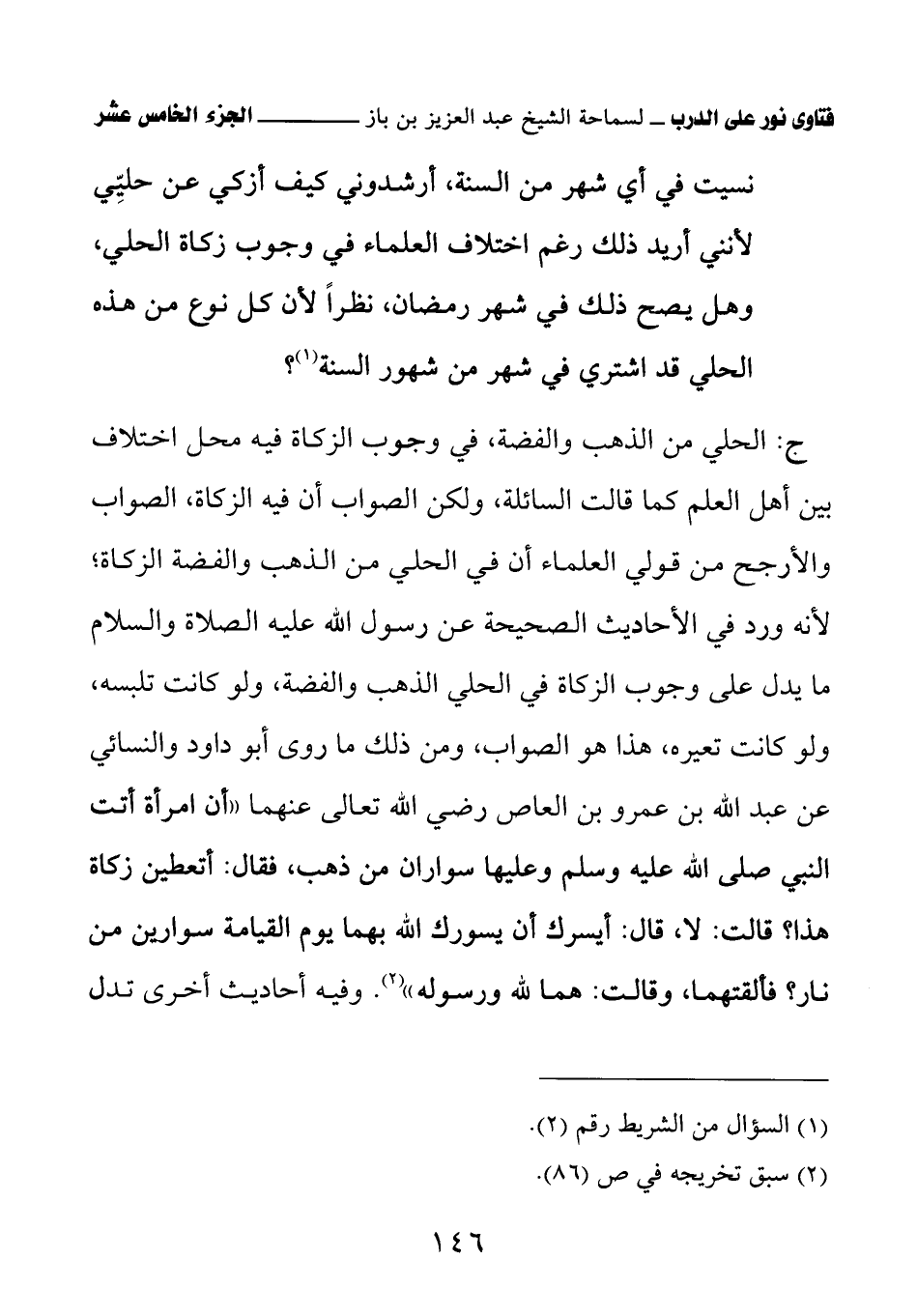 (¬3) أخرجه أبو داود في كتاب الزكاة، باب الكنز ما هو وزكاة الحلي، برقم (1563)، والنسائي في كتاب الزكاة، باب زكاة الحلي، برقم (2479).