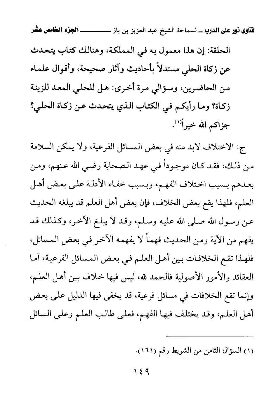 الحلقة: إن هذا معمول به في المملكة، وهنالك كتاب يتحدث عن زكاة الحلي مستدلاًّ بأحاديث وآثار صحيحة، وأقوال علماء من الحاضرين، وسؤالي مرة أخرى: هل للحلي المعد للزينة زكاة؟ وما رأيكم في الكتاب الذي يتحدث عن زكاة الحلي؟ جزاكم الله خيرًا.