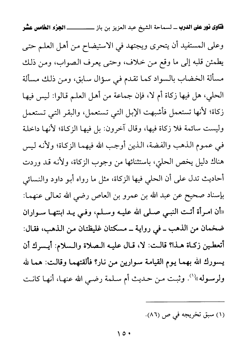 وعلى المستفيد أن يتحرى ويجتهد في الاستيضاح من أهل العلم حتى يطمئن قلبه إلى ما وقع من خلاف، وحتى يعرف الصواب، ومن ذل مسألة الخضاب بالسواد كما تقدم في سؤال سابق، ومن ذلك مسألة الحلي، هل فيها زكاة أم لا، فإن جماعة من أهل العلم قالوا: ليس فيها زكاة؛ لأنها تستعمل فأشبهت الإبل التي تستعمل، والبقر التي تستعمل وليست سائمة فلا زكاة فيها، وقال آخرون: بل فيها الزكاة؛ لأنها داخلة في عموم الذهب والفضة، الذين أوجب الله فيهما الزكاة؛ ولأنه ليس هناك دليل يخص الحليّ، باستثنائها من وجوب الزكاة، ولأنه قد وردت أحاديث تدل على أن الحلي فيها الزكاة، مثل ما رواه أبو داود والنسائي بإسناد صحيح عن عبد الله بن عمرو بن العاص رضي الله تعالى عنهما: «أن امرأة أتت النبي صلى الله عليه وسلم، وفي يد ابنتها سواران ضخمان من الذهب - في رواية - مسكتان غليظتان من الذهب، فقال: أتعطين زكاة هذا؟ قالت: لا، قال عليه الصلاة والسلام: أيسرك أن يسورك الله بهما يوم القيامة سوارين من نار؟ فألقتهما وقالت: هما لله ولرسوله» (¬1) وثبت من حديث أم سلمة رضي الله عنها، أنها كانت
