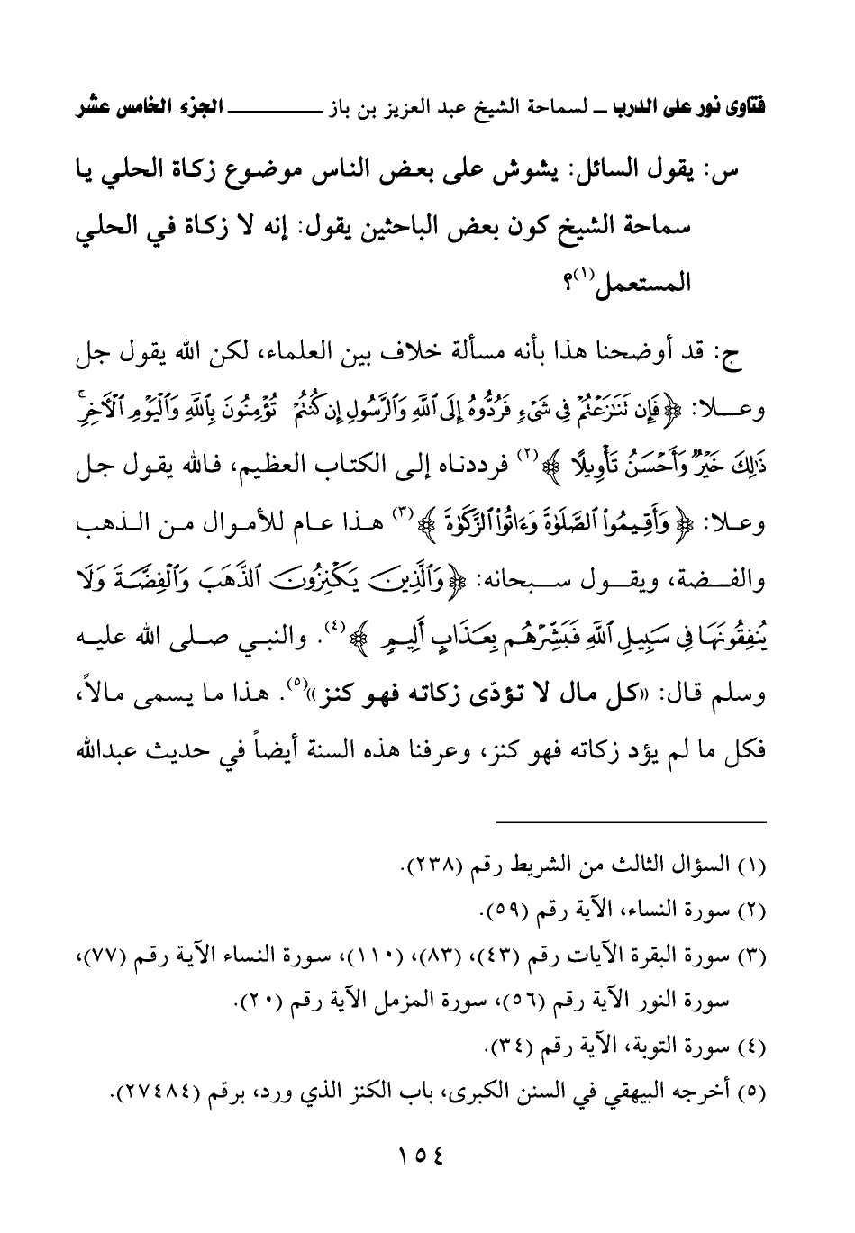 ج: قد أوضحنا هذا بأنه مسألة خلاف بين العلماء، لكن الله يقول جل وعلا: {فَإِنْ تَنَازَعْتُمْ فِي شَيْءٍ فَرُدُّوهُ إِلَى اللَّهِ وَالرَّسُولِ إِنْ كُنْتُمْ تُؤْمِنُونَ بِاللَّهِ وَالْيَوْمِ الآخِرِ ذَلِكَ خَيْرٌ وَأَحْسَنُ تَأْوِيلا} فرددناه إلى الكتاب العظيم، فالله يقول جل وعلا: {وَأَقِيمُوا الصَّلاةَ وَآتُوا الزَّكَاةَ} هذا عام للأموال من الذهب والفضة، ويقول سبحانه: {وَالَّذِينَ يَكْنِزُونَ الذَّهَبَ وَالْفِضَّةَ وَلا يُنْفِقُونَهَا فِي سَبِيلِ اللَّهِ فَبَشِّرْهُمْ بِعَذَابٍ أَلِيمٍ}. والنبي صلى الله عليه وسلم قال: «كل مال لا تؤدّى زكاته فهو كنز» (¬1) هذا ما يسمى مالاً، فكل ما لم يؤد زكاته فهو كنز، وعرفنا هذه السنة أيضًا في حديث عبد الله