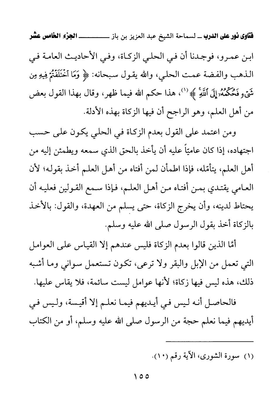 ابن عمرو، فوجدنا أن في الحلي الزكاة، وفي الأحاديث العامة في الذهب والفضة عمت الحلي، والله يقول سبحانه: {وَمَا اخْتَلَفْتُمْ فِيهِ مِنْ شَيْءٍ فَحُكْمُهُ إِلَى اللَّهِ}، هذا حكم الله فيما ظهر، وقال بهذا القول بعض من أهل العلم، وهو الراجح أن فيها الزكاة بهذه الأدلة.