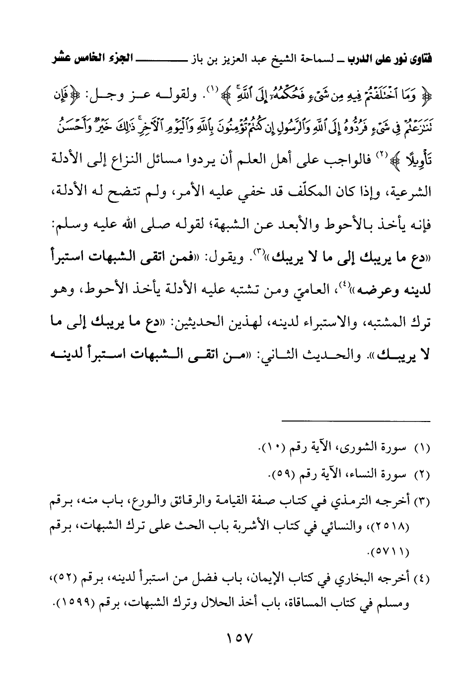 {وَمَا اخْتَلَفْتُمْ فِيهِ مِنْ شَيْءٍ فَحُكْمُهُ إِلَى اللَّهِ}. ولقوله عز وجل: {فَإِنْ تَنَازَعْتُمْ فِي شَيْءٍ فَرُدُّوهُ إِلَى اللَّهِ وَالرَّسُولِ إِنْ كُنْتُمْ تُؤْمِنُونَ بِاللَّهِ وَالْيَوْمِ الآخِرِ ذَلِكَ خَيْرٌ وَأَحْسَنُ تَأْوِيلا} فالواجب على أهل العلم أن يردوا مسائل النزاع إلى الأدلة الشرعية، وإذا كان المكلّف قد خفي عليه الأمر، ولم تتضح له الأدلة، فإنه يأخذ بالأحوط والأبعد عن الشبهة؛ لقوله صلى الله عليه وسلم: «دع ما يريبك إلى ما لا يريبك» (¬1) ويقول: «فمن اتقى الشبهات استبرأ لدينه وعرضه» (¬2) العاميّ ومن تشتبه عليه الأدلة يأخذ الأحوط، وهو ترك المشتبه، والاستبراء لدينه، لهذين الحديثين: «دع ما يريبك إلى ما لا يريبك» (¬3). والحديث الثاني: «من اتقى الشبهات استبرأ لدينه