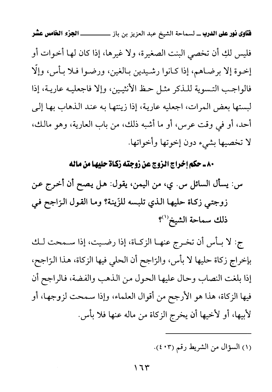 س: يسأل السائل س. ي، من اليمن، يقول: هل يصح أن أخرج عن زوجتي زكاة حليها الذي تلبسه للزّينة؟ وما القول الرّاجح في ذلك سماحة الشيخ؟ (¬1)