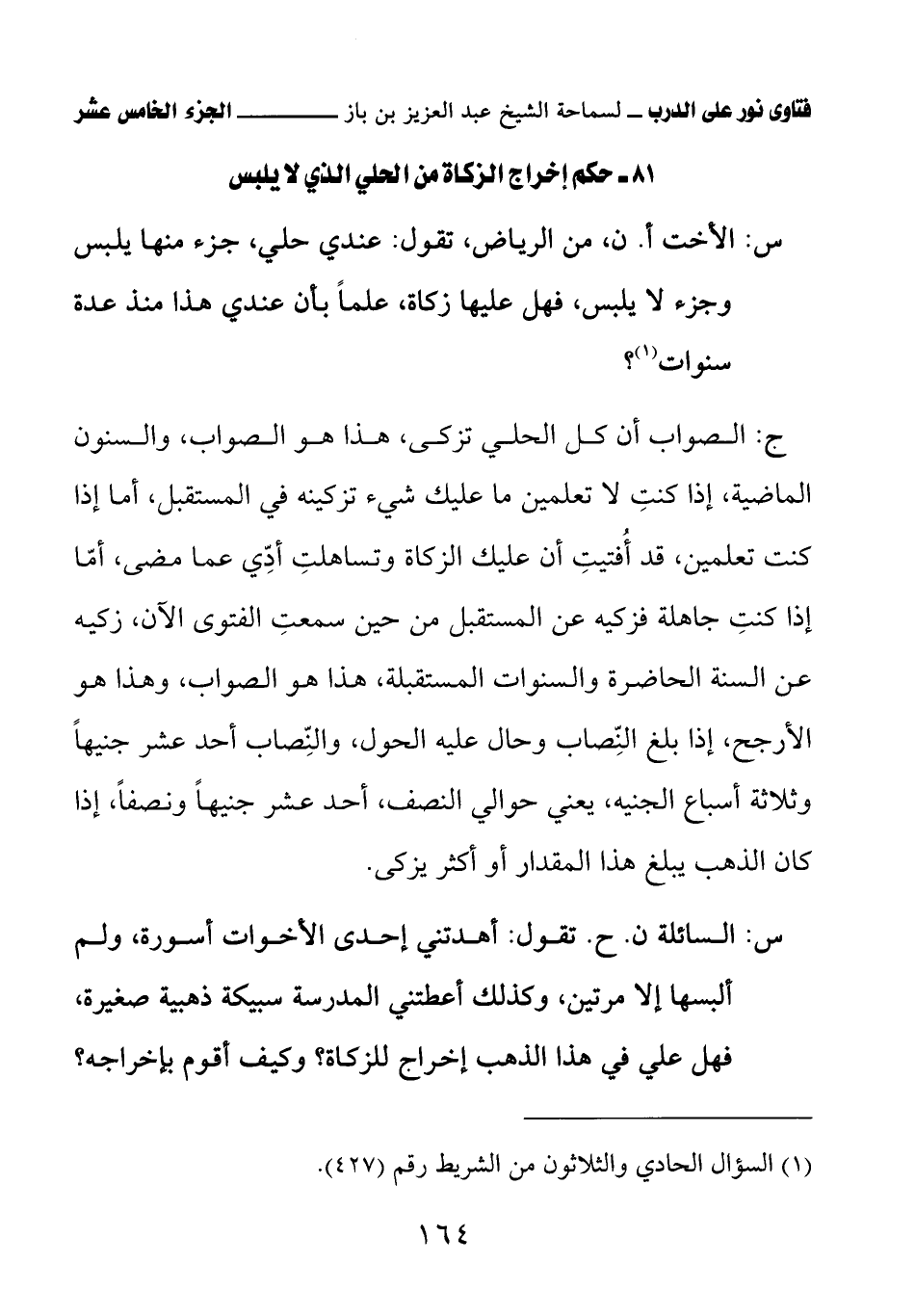 ج: الصواب أن كل الحلي تزكى، هذا هو الصواب، والسنون الماضية، إذا كنتِ لا تعلمين ما عليك شيء تزكينه في المستقبل، أما إذا كنت تعلمين، قد أُفتيتِ أن عليك الزكاة وتساهلتِ أدِّي عما مضى، أمّا إذا كنتِ جاهلة فزكيه عن المستقبل من حين سمعتِ الفتوى الآن، زكيه عن السنة الحاضرة والسنوات المستقبلة، هذا هو الصواب، وهذا هو الأرجح، إذا بلغ النِّصاب وحال عليه الحول، والنِّصاب أحد عشر جنيهًا وثلاثة أسباع الجنيه، يعني حوالي النصف، أحد عشر جنيهًا ونصفًا، إذا كان الذهب يبلغ هذا المقدار أو أكثر يزكى.