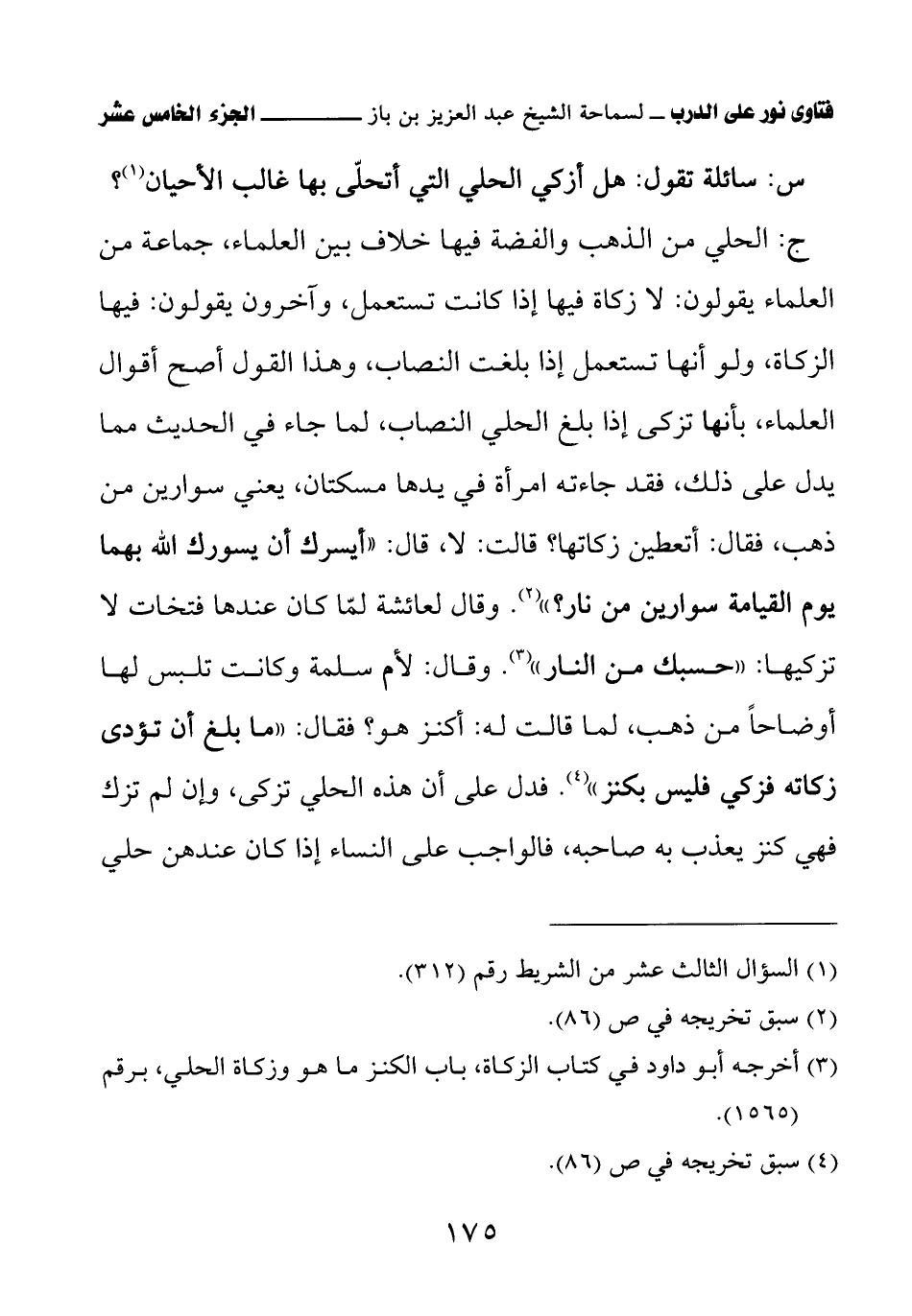 ج: الحلي من الذهب والفضة فيها خلاف بين العلماء، جماعة من العلماء يقولون: لا زكاة فيها إذا كانت تستعمل، وآخرون يقولون: فيها الزكاة، ولو أنها تستعمل إذا بلغت النصاب، وهذا القول أصح أقوال العلماء، بأنها تزكى إذا بلغ الحلي النصاب، لما جاء في الحديث مما يدل على ذلك، فقد جاءته امرأة في يدها مسكتان، يعني سوارين من ذهب، فقال: أتعطين زكاتها؟ قالت: لا، قال: «أيسرك أن يسورك الله بهما يوم القيامة سوارين من نار؟» (¬2) وقال لعائشة لمّا كان عندها فتخات لا تزكيها: «حسبك من النار» (¬3) وقال: لأم سلمة وكانت تلبس لها أوضاحًا من ذهب، لما قالت له: أكنز هو؟ فقال: «ما بلغ أن تؤدي زكاته فزكي فليس بكنز» (¬4) فدل على أن هذه الحلي تزكى، وإن لم تزك فهي كنز يعذب به صاحبه، فالواجب على النساء إذا كان عندهن حلي