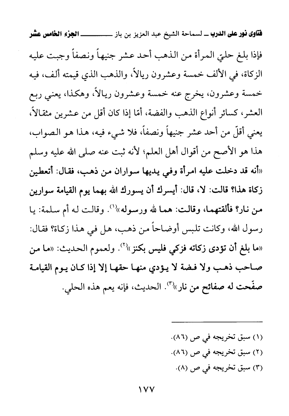 فإذا بلغ حليّ المرأة من الذهب أحد عشر جنيهًا ونصفًا وجبت عليه الزكاة، في الألف خمسة وعشرون ريالاً، والذهب الذي قيمته ألف، فيه خمسة وعشرون، يخرج عنه خمسة وعشرون ريالاً، وهكذا، يعني ربع العشر، كسائر أنواع الذهب والفضة، أمّا إذا كان أقل من عشرين مثقالاً، يعني أقلّ من أحد عشر جنيهًا ونصفًا، فلا شيء فيه، هذا هو الصواب، هذا هو الأصح من أقوال أهل العلم؛ لأنه ثبت عنه صلى الله عليه وسلم «أنه قد دخلت عليه امرأة وفي يديها سواران من ذهب، فقال: أتعطين زكاة هذا؟ قالت: لا، قال: أيسرك أن يسورك الله بهما يوم القيامة سوارين من نار؟ فألقتهما، وقالت: هما لله ورسوله» (¬1). «وقالت له أم سلمة: يا رسول الله، وكانت تلبس أوضاحًا من ذهب، هل في هذا زكاة؟ فقال: ما بلغ أن تؤدى زكاته فزكي فليس بكنز» (¬2) ولعموم الحديث: «ما من صاحب ذهب ولا فضة لا يؤدي منها حقها إلا إذا كان يوم القيامة صفّحت له صفائح من نار» (¬3) الحديث، فإنه يعم هذه الحلي.