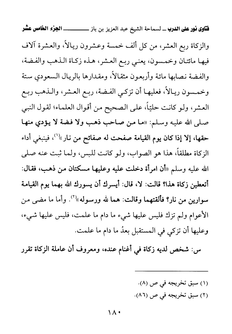 والزكاة ربع العشر، من كل ألف خمسة وعشرون ريالاً، والعشرة آلاف فيها مائتان وخمسون، يعني ربع العشر، هذه زكاة الذهب والفضة، والفضة نصابها مائة وأربعون مثقالاً، ومقدارها بالريال السعودي ستة وخمسون ريالاً، فعليها أن تزكي الفضة، ربع العشر، والذهب ربع العشر، ولو كانت حليًّا، على الصحيح من أقوال العلماء؛ لقول النبي صلى الله عليه وسلم: «ما من صاحب ذهب ولا فضة لا يؤدي منها حقها، إلا إذا كان يوم القيامة صفحت له صفائح من نار» (¬1) فينبغي أداء الزكاة مطلقًا، هذا هو الصواب، ولو كانت للبس، ولما ثبت عنه صلى الله عليه وسلم «أن امرأة دخلت عليه وعليها مسكتان من ذهب، فقال: أتعطين زكاة هذا؟ قالت: لا، قال: أيسرك أن يسورك الله بهما يوم القيامة سوارين من نار؟ فألقتهما وقالت: هما لله ورسوله» (¬2) وأما ما مضى من الأعوام ولم تزك فليس عليها شيء ما دام ما علمت، فليس عليها شيء، وعليها أن تزكي في المستقبل بعدُ ما دام ما علمت.