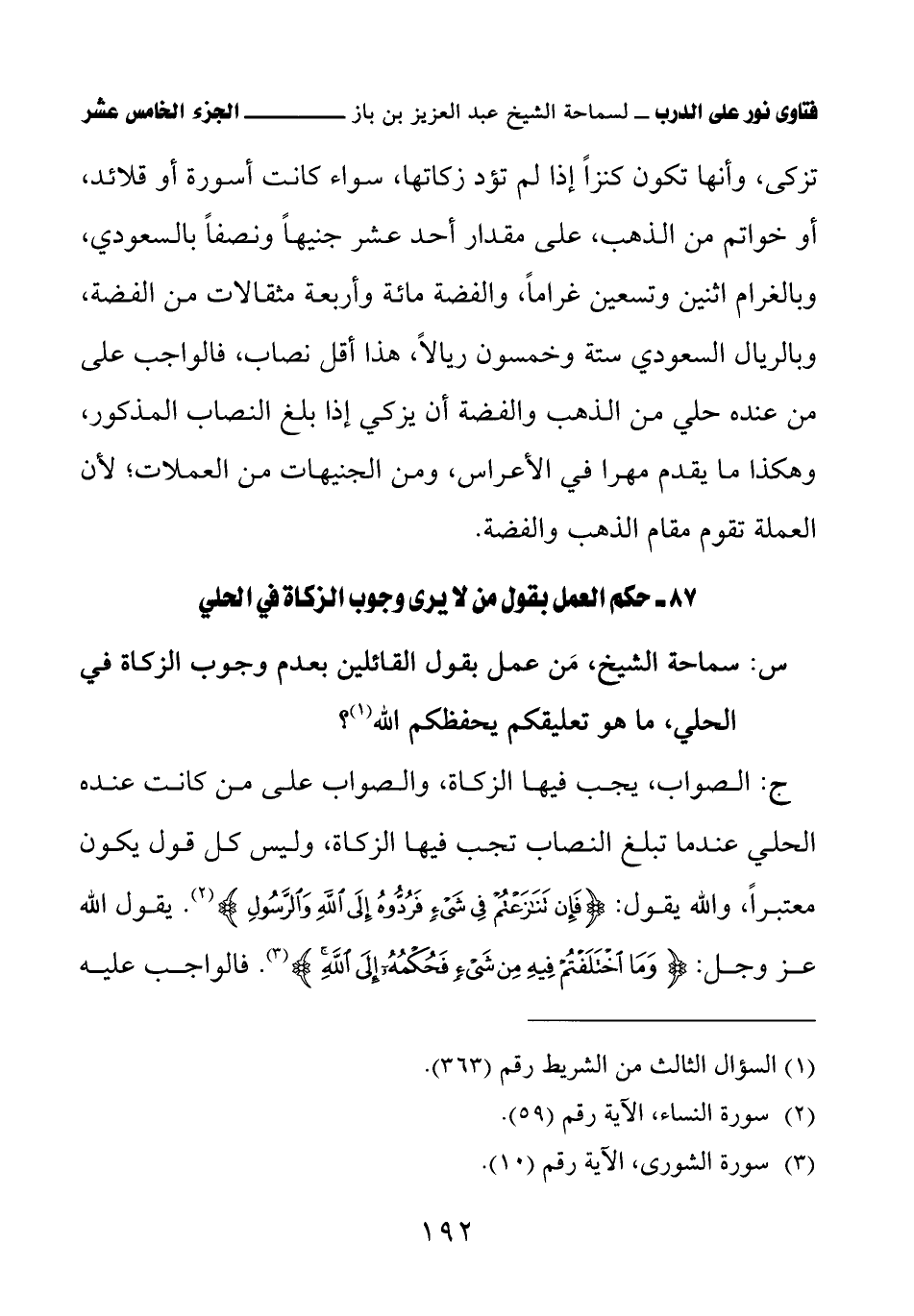 ج: الصواب، يجب فيها الزكاة، والصواب على من كانت عنده الحلي عندما تبلغ النصاب تجب فيها الزكاة، وليس كل قول يكون معتبرًا، والله يقول: {فَإِنْ تَنَازَعْتُمْ فِي شَيْءٍ فَرُدُّوهُ إِلَى اللَّهِ وَالرَّسُولِ}. يقول الله عز وجل: {وَمَا اخْتَلَفْتُمْ فِيهِ مِنْ شَيْءٍ فَحُكْمُهُ إِلَى اللَّهِ}. فالواجب عليه