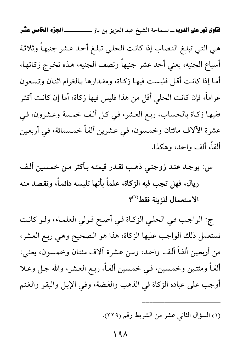 هي التي تبلغ النصاب إذا كانت الحلي تبلغ أحد عشر جنيهًا وثلاثة أسباع الجنيه، يعني أحد عشر جنيهًا ونصف الجنيه، هذه تخرج زكاتها، أما إذا كانت أقل فليست فيها زكاة، ومقدارها بالغرام اثنان وتسعون غرامًا، فإن كانت الحلي قل من هذا فليس فيها زكاة، أما إن كانت أكثر ففيها زكاة بالحساب، ربع العشر، في كل ألف خمسة وعشرون، في عشرة الآلاف مائتان وخمسون، في عشرين ألفًا خمسمائة، في أربعين ألفًا، ألف واحد، وهكذا.