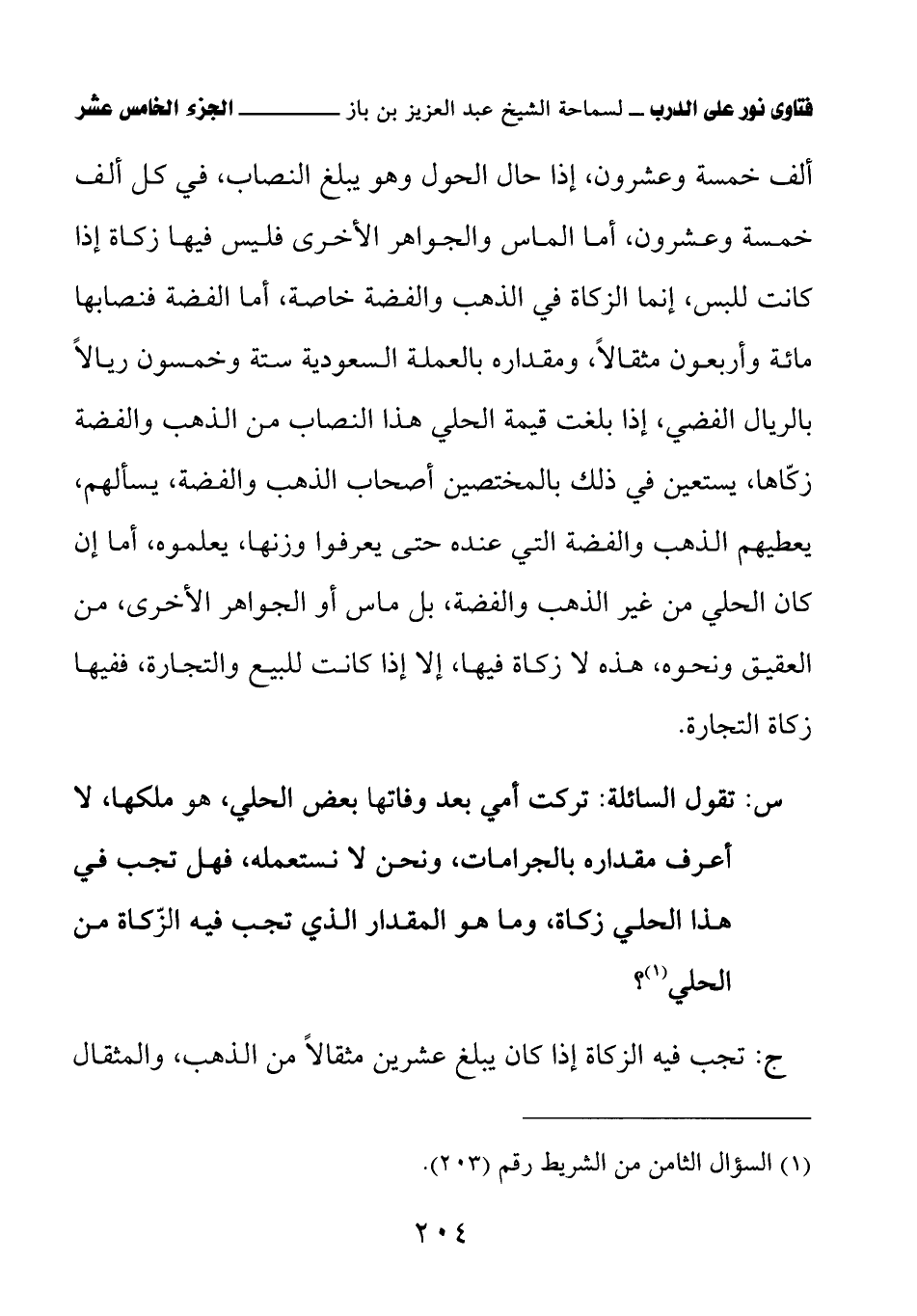 ألف خمسة وعشرون، إذا حال الحول وهو يبلغ النصاب، في كل ألف خمسة وعشرون، أما الماس والجواهر الأخرى فليس فيها زكاة إذا كانت للبس، إنما الزكاة في الذهب والفضة خاصة، أما الفضة فنصابها مائة وأربعون مثقالاً، ومقداره بالعملة السعودية ستة وخمسون ريالاً بالريال الفضي، إذا بلغت قيمة الحلي هذا النصاب من الذهب والفضة زكّاها، يستعين في ذلك بالمختصين أصحاب الذهب والفضة، يسألهم، يعطيهم الذهب والفضة التي عنده حتى يعرفوا وزنها، يعلموه، أما إن كان الحلي من غير الذهب والفضة، بل ماس أو الجواهر الأخرى، من العقيق ونحوه، هذه لا زكاة فيها، إلا إذا كانت للبيع والتجارة، ففيها زكاة التجارة.