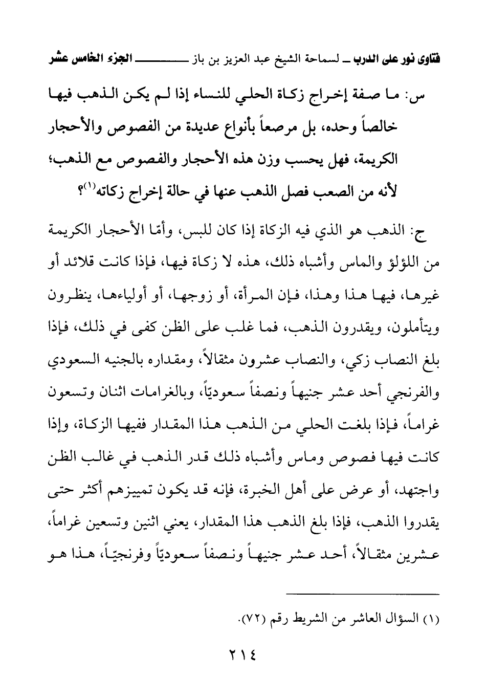ج: الذهب هو الذي فيه الزكاة إذا كان للبس، وأمّا الأحجار الكريمة من اللؤلؤ والماس وأشباه ذلك، هذه لا زكاة فيها، فإذا كانت قلائد أو غيرها، فيها هذا وهذا، فإن المرأة، أو زوجها، أو أولياءها، ينظرون ويتأملون، ويقدرون الذهب، فما غلب على الظن كفى في ذلك، فإذا بلغ النصاب زكي، والنصاب عشرون مثقالاً، ومقداره بالجنيه السعودي والفرنجي أحد عشر جنيهًا ونصفًا سعوديًّا، وبالغرامات اثنان وتسعون غرامًا، فإذا بلغت الحلي من الذهب هذا المقدار ففيها الزكاة، وإذا كانت فيها فصوص وماس وأشباه ذلك قدر الذهب في غالب الظن واجتهد، أو عرض على أهل الخبرة، فإنه قد يكون تمييزهم أكثر حتى يقدروا الذهب، فإذا بلغ الذهب هذا المقدار، يعني اثنين وتسعين غرامًا، عشرين مثقالاً، أحد عشر جنيهًا ونصفًا سعوديًّا وفرنجيًّا، هذا هو