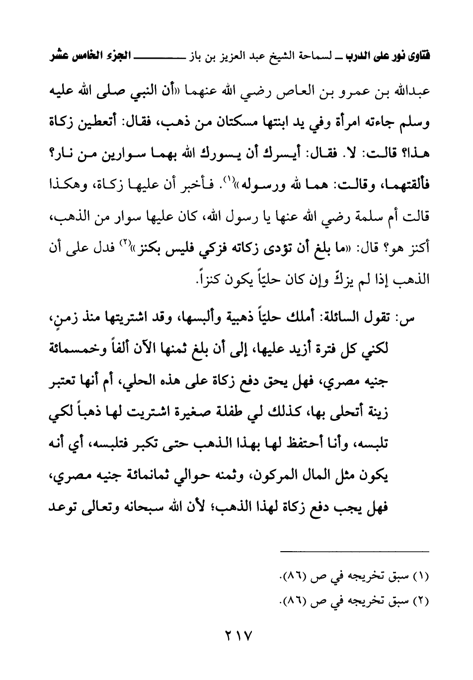 (¬1) أخرجه أبو داود في كتاب الزكاة، باب الكنز ما هو وزكاة الحلي، برقم (1563)، والنسائي في كتاب الزكاة، باب زكاة الحلي، برقم (2479).