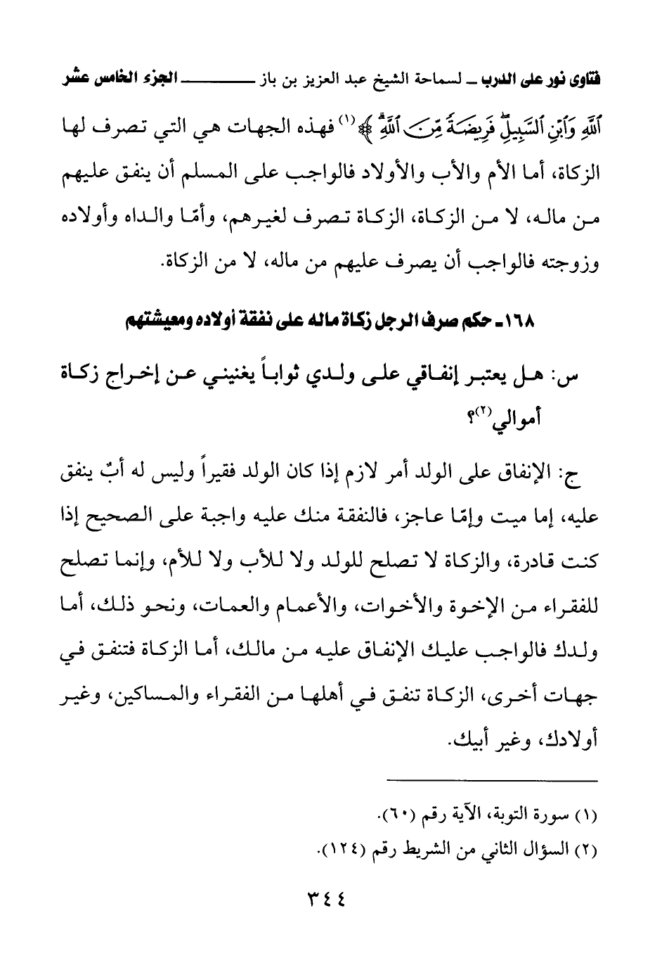 فهذه الجهات هي التي تصرف لها الزكاة، أما الأم والأب والأولاد فالواجب على المسلم أن ينفق عليهم من ماله، لا من الزكاة، الزكاة تصرف لغيرهم، وأمّا والداه وأولاده وزوجته فالواجب أن يصرف عليهم من ماله، لا من الزكاة.