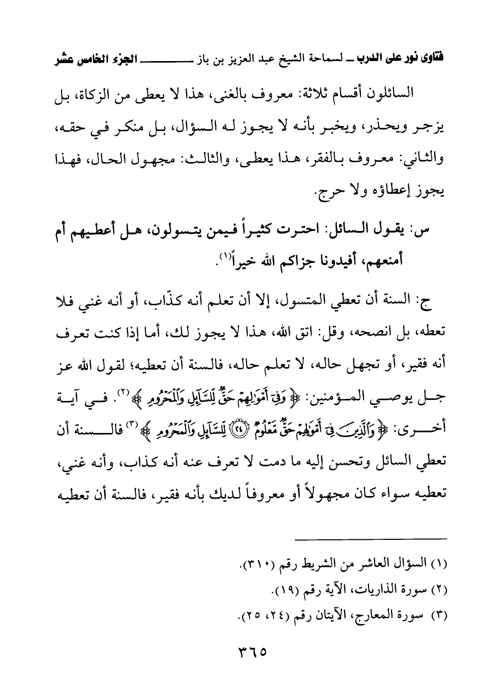 السائلون أقسام ثلاثة: معروف بالغنى، هذا لا يعطى من الزكاة، بل يزجر ويحذر، ويخبر بأنه لا يجوز له السؤال، بل منكر في حقه، والثاني: معروف بالفقر، هذا يعطى، والثالث: مجهول الحال، فهذا يوز إعطاؤه ولا حرج.