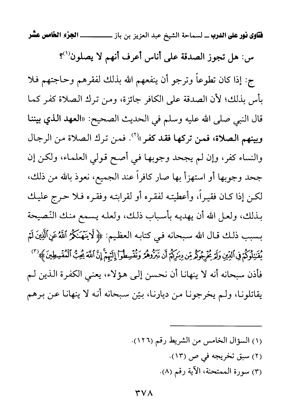 ج: إذا كان تطوعًا وترجو أن ينفعهم الله بذلك لفقرهم وحاجتهم فلا بأس بذلك؛ لأن الصدقة على الكافر جائزة، ومن ترك الصلاة كفر كما قال النبي صلى الله عليه وسلم في الحديث الصحيح: «العهد الذي بيننا وبينهم الصلاة، فمن تركها فقد كفر» (¬2) فمن ترك الصلاة من الرجال والنساء كفر، وإن لم يجحد وجوبها في أصح قولي العلماء، ولكن إن جحد وجوبها أو استهزأ بها صار كافرًا عند الجميع، نعوذ بالله من ذلك، لكن إذا كان فقيرًا، وأعطيته لفقره أو لقرابته وفقره فلا حرج عليك بذلك، ولعل الله أن يهديه بأسباب ذلك، ولعله يسمع منك النّصيحة بسبب ذلك قال الله سبحانه في كتابه العظيم: {لا يَنْهَاكُمُ اللَّهُ عَنِ الَّذِينَ لَمْ يُقَاتِلُوكُمْ فِي الدِينِ وَلَمْ يُخْرِجُوكُمْ مِنْ دِيَارِكُمْ أَنْ تَبَرُّوهُمْ وَتُقْسِطُوا إِلَيْهِمْ إِنَّ اللَّهَ يُحِبُّ الْمُقْسِطِينَ} فأذن سبحانه أنه لا ينهانا أن نحسن إلى هؤلاء، يعني الكفرة الذين لم يقاتلونا، ولم يخرجونا من ديارنا، بيّن سبحانه أنه لا ينهانا عن برهم