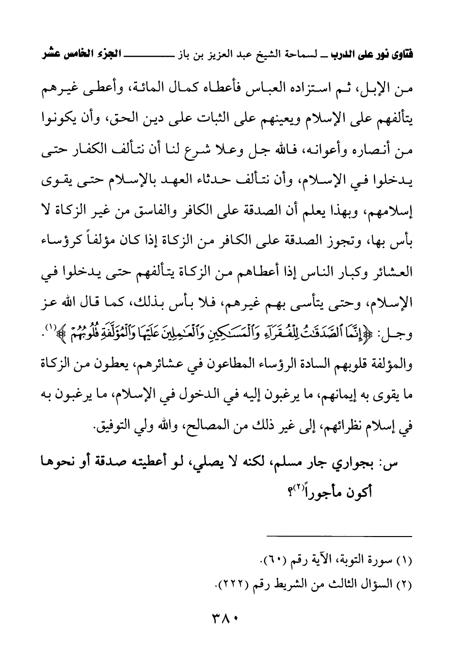 من الإبل، ثم استزاده العباس فأعطاه كمال المائة، وأعطى غيرهم يتألفهم على الإسلام ويعينهم على الثبات على دين الحق، وأن يكونوا من أنصاره وأعوانه، فالله جل وعلا شرع لنا أن نتألف الكفار حتى يدخلوا في الإسلام، وأن نتألف حدثاء العهد بالإسلام حتى يقوى إسلامهم، وبهذا يعلم أن الصدقة على الكافر والفاسق من غير الزكاة لا بأس بها، وتجوز الصدقة على الكافر من الزكاة إذا كان مؤلفًا كرؤساء العشائر وكبار الناس إذا أعطاهم من الزكاة يتألفهم حتى يدخلوا في الإسلام، وحتى يتأسى بهم غيرهم، فلا بأس بذلك، كما قال الله عز وجل: {إِنَّمَا الصَّدَقَاتُ لِلْفُقَرَاءِ وَالْمَسَاكِينِ وَالْعَامِلِينَ عَلَيْهَا وَالْمُؤَلَّفَةِ قُلُوبُهُمْ}. والمؤلفة قلوبهم السادة الرؤساء المطاعون في عشائرهم، يعطون من الزكاة ما يقوى به إيمانهم، ما يرغبون إليه في الدخول في الإسلام، ما يرغبون به في إسلام نظرائهم، إلى غير ذلك من المصالح، والله ولي التوفيق.