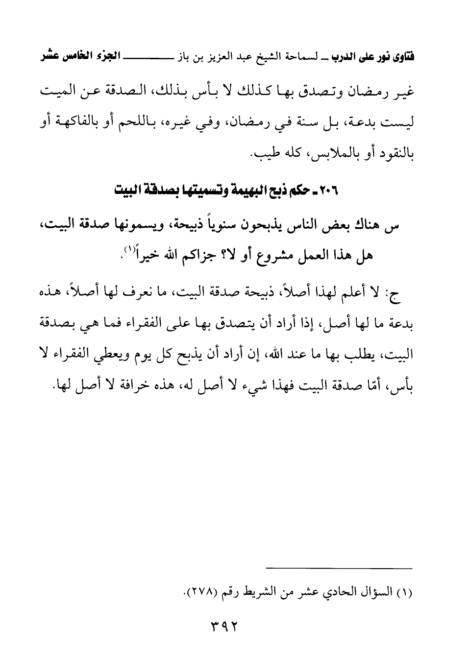 ج: لا أعلم لهذا أصلاً، ذبيحة صدقة البيت، ما نعرف لها أصلاً، هذه بدعة ما لها أصل، إذا أراد أن يتصدق بها على الفقراء فما هي بصدقة البيت، يطلب بها ما عند الله، إن أراد أن يذبح كل يوم ويعطي الفقراء لا بأس، أمّا صدقة البيت فهذا شيء لا أصل له، هذه خرافة لا أصل لها.