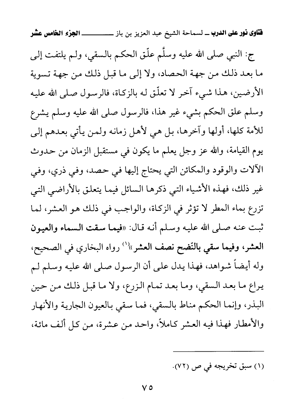 ج: النبي صلى الله عليه وسلَّم علّق الحكم بالسقي، ولم يلتفت إلى ما بعد ذلك من جهة الحصاد، ولا إلى ما قبل ذلك من جهة تسوية الأرضين، هذا شيء آخر لا تعلّق له بالزكاة، فالرسول صلى الله عليه وسلم علق الحكم بشيء غير هذا، فالرسول صلى الله عليه وسلم يشرع للأمة كلها، أولها وآخرها، بل هي لأهل زمانه ولمن يأتي بعدهم إلى يوم القيامة، والله عز وجل يعلم ما يكون في مستقبل الزمان من حدوث الآلات والوقود والمكائن التي يحتاج إليها في حصد، وفي ذري، وفي غير ذلك، فهذه الأشياء التي ذكرها السائل فيما يتعلق بالأراضي التي تزرع بماء المطر لا تؤثر في الزكاة، والواجب في ذلك هو العشر، لما ثبت عنه صلى الله عليه وسلم أنه قال: «فيما سقت السماء والعيون العشر، وفيما سقي بالنّضح نصف العشر» (¬1) رواه البخاري في الصحيح، وله أيضًا شواهد، فهذا يدل على أن الرسول صلى الله عليه وسلم لم يراع ما بعد السقي، وما بعد تمام الزرع، ولا ما قبل ذلك من حين البذر، وإنما الحكم مناط بالسقي، فما سقي بالعيون الجارية والأنهار والأمطار فهذا فيه العشر كاملاً، واحد من عشرة، من كل ألف مائة،