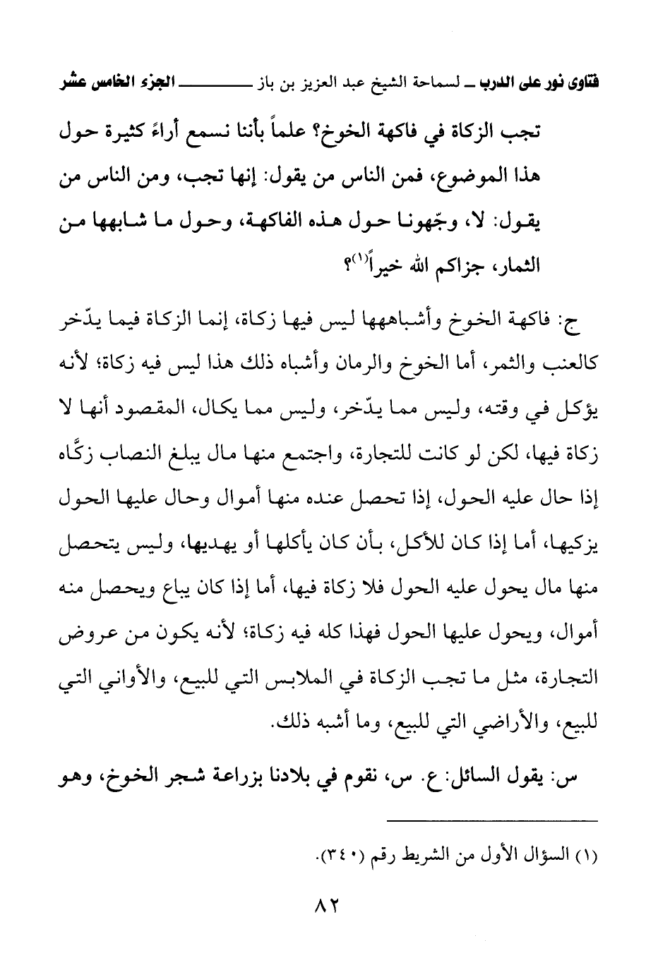 ج: فاكهة الخوخ وأشباهها ليس فيها زكاة، إنما الزكاة فيما يدّخر كالعنب والثمر، أما الخوخ والرمان وأشباه ذلك هذا ليس فيه زكاة؛ لأنه يؤكل في وقته، وليس مما يدّخر، وليس مما يكال، المقصود أنها لا زكاة فيها، لكن لو كانت للتجارة، واجتمع منها مال يبلغ النصاب زكَّاه إذا حال عليه الحول، إذا تحصل عنده منها أموال وحال عليها الحول يزكيها، أما إذا كان للأكل، بأن كان يأكلها أو يهديها، وليس يتحصل منها مال يحول عليه الحول فلا زكاة فيها، أما إذا كان يباع ويحصل منه أموال، ويحول عليها الحول فهذا كله فيه زكاة؛ لأنه يكون من عروض التجارة، مثل ما تجب الزكاة في الملابس التي للبيع، والأواني التي للبيع، والأراضي التي للبيع، وما أشبه ذلك.
