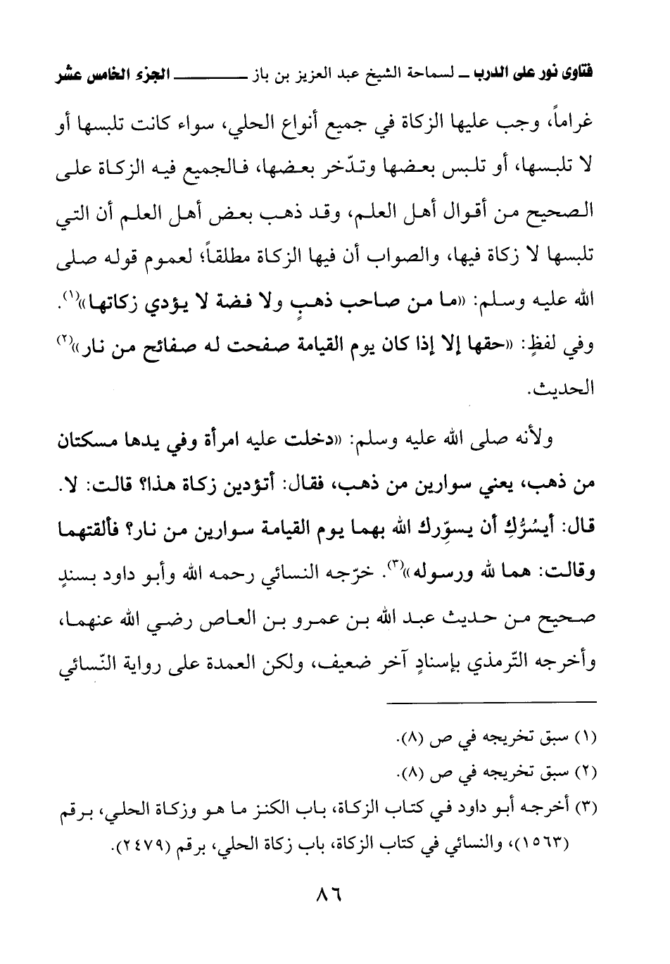 (¬3) أخرجه أبو داود في كتاب الزكاة، باب الكنز ما هو وزكاة الحلي، برقم (1563)، والنسائي في كتاب الزكاة، باب زكاة الحلي، برقم (2479).