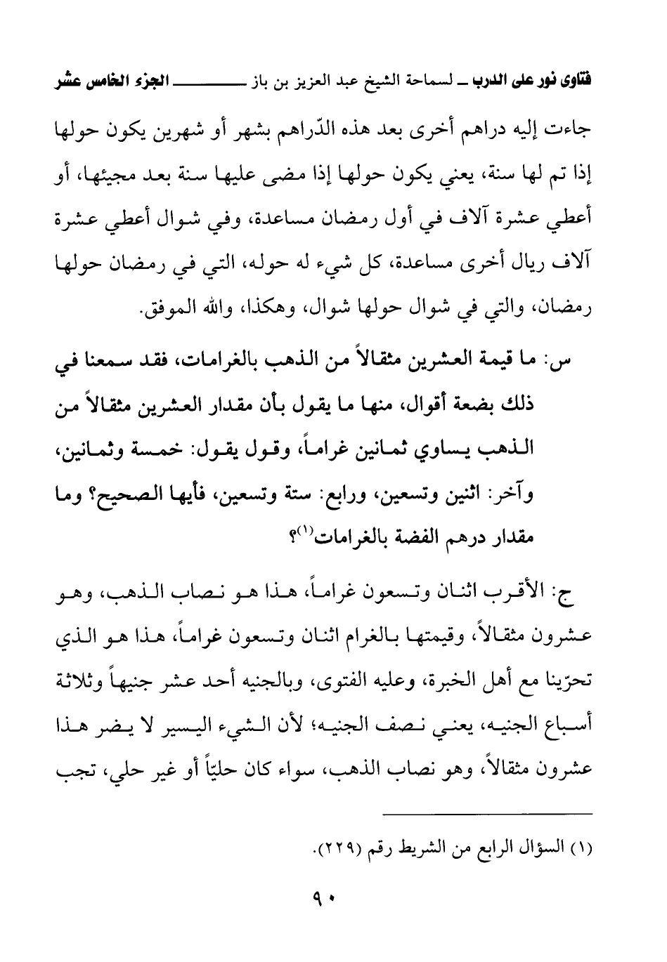 ج: الأقرب اثنان وتسعون غرامًا، هذا هو نصاب الذهب، وهو عشرون مثقالاً، وقيمتها بالغرام اثنان وتسعون غرامًا، هذا هو الذي تحرّينا مع أهل الخبرة، وعليه الفتوى، وبالجنيه أحد عشر جنيهًا وثلاثة أسباع الجنيه، يعني نصف الجنيه؛ لأن الشيء اليسير لا يضر هذا عشرون مثقالاً، وهو نصاب الذهب، سواء كان حليًّا أو غير حلي، تجب