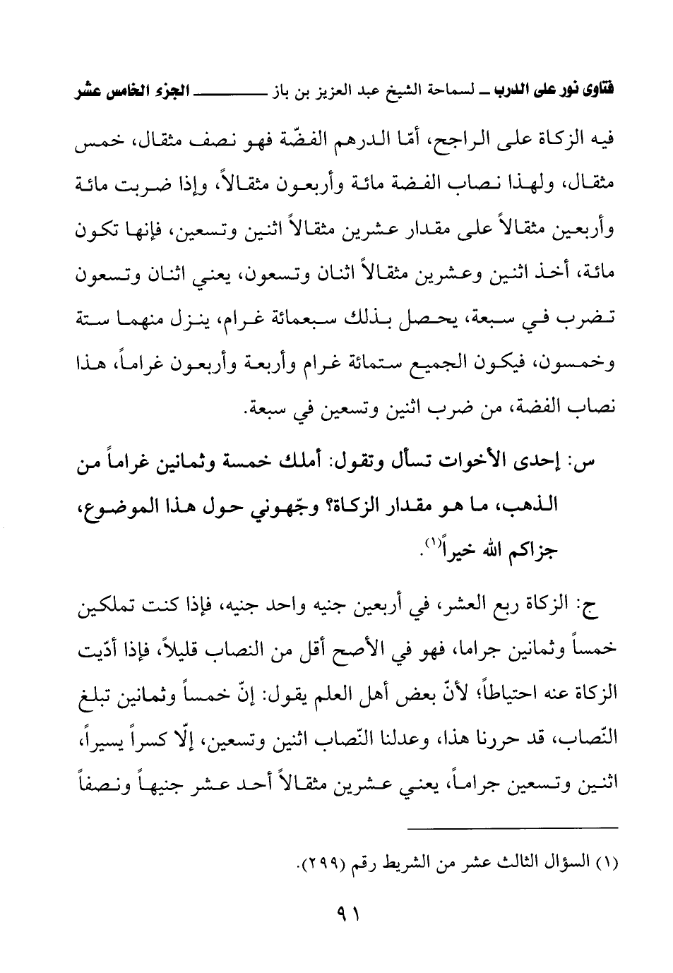 ج: الزكاة ربع العشر، في أربعين جنيه واحد جنيه، فإذا كنت تملكين خمسًا وثمانين جراما، فهو في الأصح أقل من النصاب قليلاً، فإذا أدّيت الزكاة عنه احتياطًا؛ لأنّ بعض أهل العلم يقول: إنّ خمسًا وثمانين تبلغ النّصاب، قد حررنا هذا، وعدلنا النّصاب اثنين وتسعين، إلاّ كسرًا يسيرًا، اثنين وتسعين جرامًا، يعني عشرين مثقالاً أحد عشر جنيهًا ونصفًا