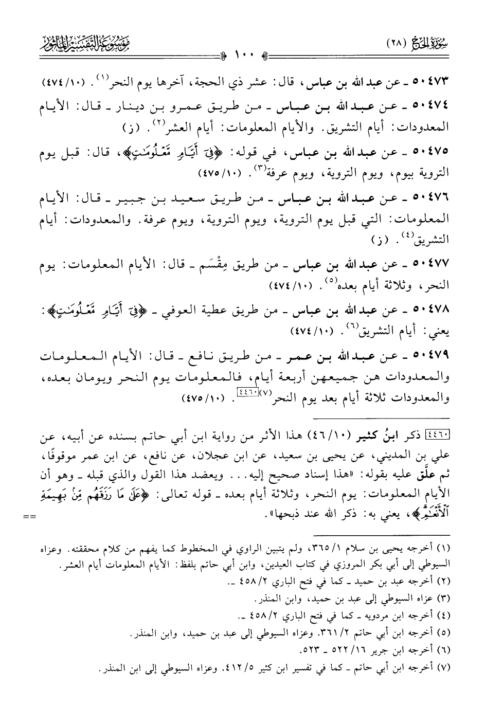 [٤٤٦٠] ذكر ابنُ كثير (١٠/ ٤٦) هذا الأثر من رواية ابن أبي حاتم بسنده عن أبيه، عن علي بن المديني، عن يحيى بن سعيد، عن ابن عجلان، عن نافع، عن ابن عمر موقوفًا، ثم علَّق عليه بقوله: «هذا إسناد صحيح إليه ... ويعضد هذا القول والذي قبله -وهو أن الأيام المعلومات: يوم النحر، وثلاثة أيام بعده- قوله تعالى: {عَلى ما رَزَقَهُمْ مِن بَهِيمَةِ الأَنْعامِ}، يعني به: ذكر الله عند ذبحها».