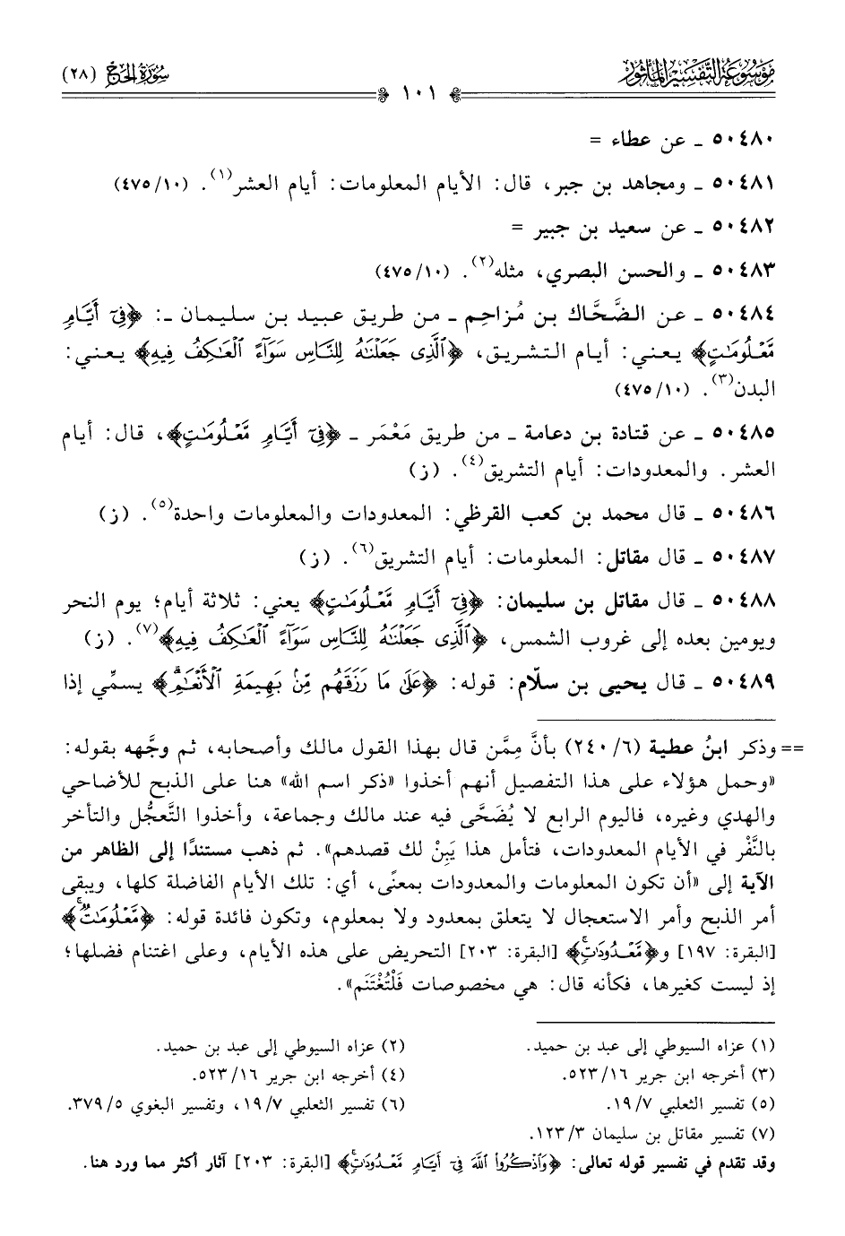 ٥٠٤٨٦ - قال محمد بن كعب القرظي: المعدودات والمعلومات واحدة (¬٥). (ز)