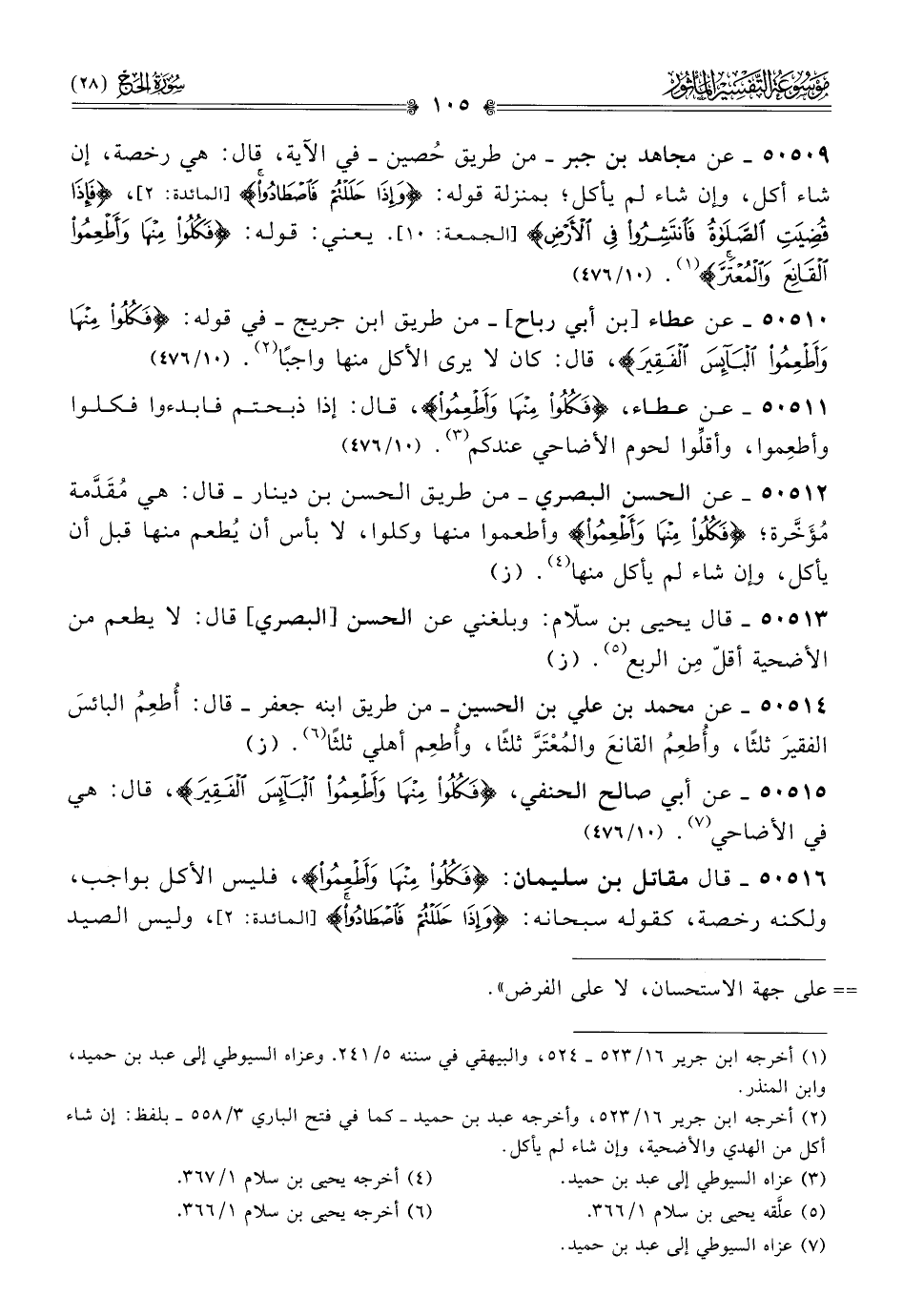٥٠٥٠٩ - عن مجاهد بن جبر -من طريق حُصين- في الآية، قال: هي رخصة، إن شاء أكل، وإن شاء لم يأكل؛ بمنزلة قوله: {واذ حللتم فاصطادوا} [المائدة: ٢]، {فإذا قضيت الصلاة فانتشروا في الأرض} [الجمعة: ١٠]. يعني: قوله: {فكلوا منها وأطعموا القانع والمعتر} (¬١). (١٠/ ٤٧٦)