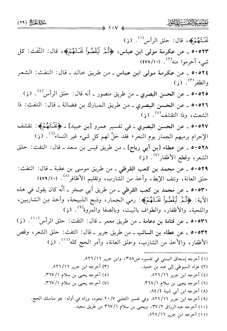 ٥٠٥٢٣ - عن عكرمة مولى ابن عباس، {ثم ليقضوا تفثهم}، قال: التَّفَث: كل شيء أحرموا منه (¬٢). (١٠/ ٤٧٨)