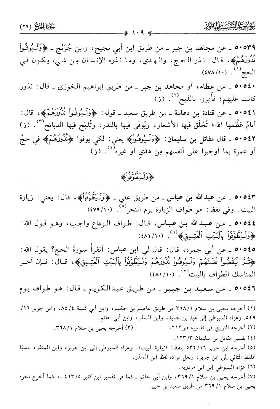 ٥٠٥٣٩ - عن مجاهد بن جبر -من طريق ابن أبي نجيح، وابن جُرَيْج- {وليوفوا نذورهم}، قال: نذر الحج، والهدي، وما نذره الإنسان مِن شيء يكون في الحج (¬١). (١٠/ ٤٧٨)