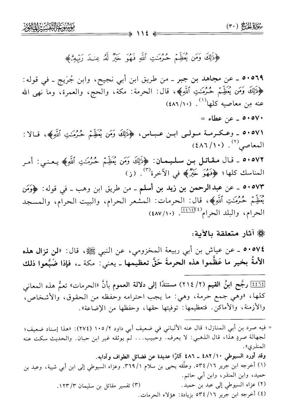 ٥٠٥٧٣ - عن عبد الرحمن بن زيد بن أسلم -من طريق ابن وهب- في قوله: {ومن يعظم حرمات الله}، قال: الحرمات: المشعر الحرام، والبيت الحرام، والمسجد الحرام، والبلد الحرام (¬٤) [٤٤٦٤]. (١٠/ ٤٨٧)